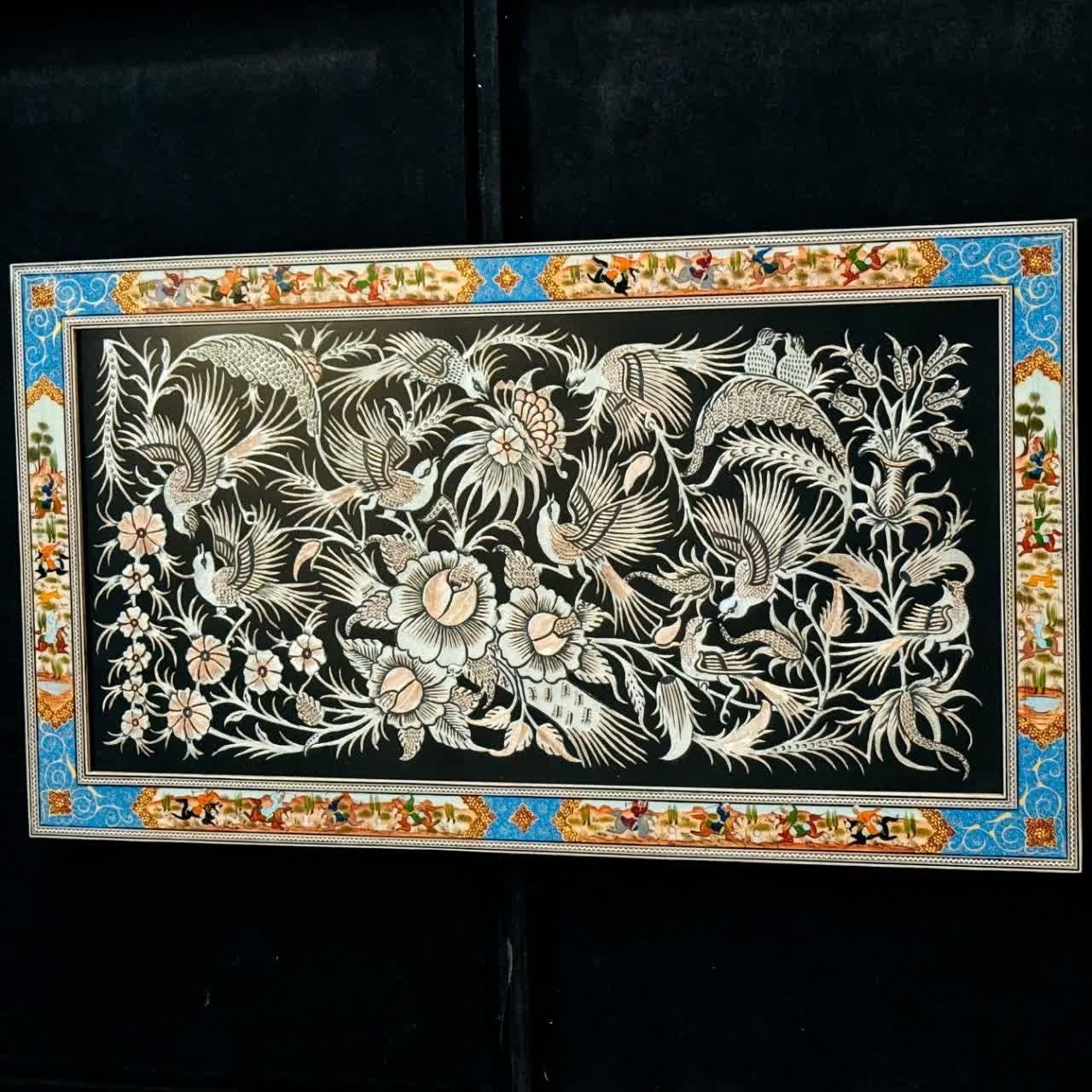ابعادکلی این تابلوی زیبا 50در90 متر و ابعادی که پلاک مسی در آن قرار میگیرد 40در80 می باشد. تابلو قلمزنی گل و مرغ با قاب خاتم کاری بسیار زیبا و نفیس اثر هنرمندان اصفهان با تلفیق هنرهای قلم زنی ، خاتم کاری پلاک داخلی طرح گل و مرغ برجسته بر روی مس می باشد. لطفاً قبل از سفارش طرح مورد نظرتون رو استعلام بگیرید و با اطمینان خرید کنید.