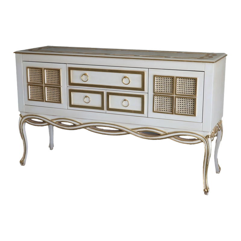 میز کنسول چوبی ایتالیایی ابزاری همان طور که مشاهده میکنید، از رنگ و طرح جذابی استفاده کرده است، یکی از نکتههای قوت در میز کنسول چوبی ایتالیایی ابزاری بهره گیری از رنگ طلایی در میز کنسول میباشد که چشم زی بالایی به کار بخشیده است و میتواند پیشنهاد خوبی برای دکوراسیون منزل شما باشد، در ادامه توضیحات بیشتری درباره این میز کنسول به شما خواهیم داد. یکی از فواید و کارایی میز کنسول در دکوراسیون منازل، امکان دسترسی بهتر وسایل پذیرایی در منزل میباشد شما میتوانید هر نوع وسیله ای تزئینی و یا وسایل پذیرایی را در میز کنسول خود جای بدهید، اما اگر توجه نمایید علاوه بر اینکه فضای دسترسی خوبی دارد، ظاهر با شکوه و جذابی هم دارد که زیبایی کار را چندین برابر کرده است. از متریالی که در میز کنسول چوبی ایتالیایی به کار رفته است میتوان به استفاده از چوب راش گرجستان در قسمت پایه و همچنین بهره گیری از ام دی اف واناچای تایلند در قسمت رویه میز آن اشاره داشته باشیم، همچنین اینکه طرح حصیری و پنجرهای که در میز کنسول به کار رفته است. از ویژگیهای مهم در میز کنسول چوبی میتوان به پایههای بلند و همچنین نوع رنگ پردازی زیبای میز کنسول آن بپردازیم توجه فرمایید که رنگ تنوع به کار برده شده برای رنگ منبت، حصیر، حاشیه دور کشو، طرح رنگی روی میز، هلال قسمت پایه میز، رنگ دستگیره ها میباشد. رنگ پایه میز کنسول ایتالیایی ابزاری رنگ سفید می باشد که در تنوع شما با انتخاب رنگ های مثلا طلایی، آبی، قرمز، و هر رنگ دیگری، رنگ حاشیه این میز کنسول را انتخاب میکنید.