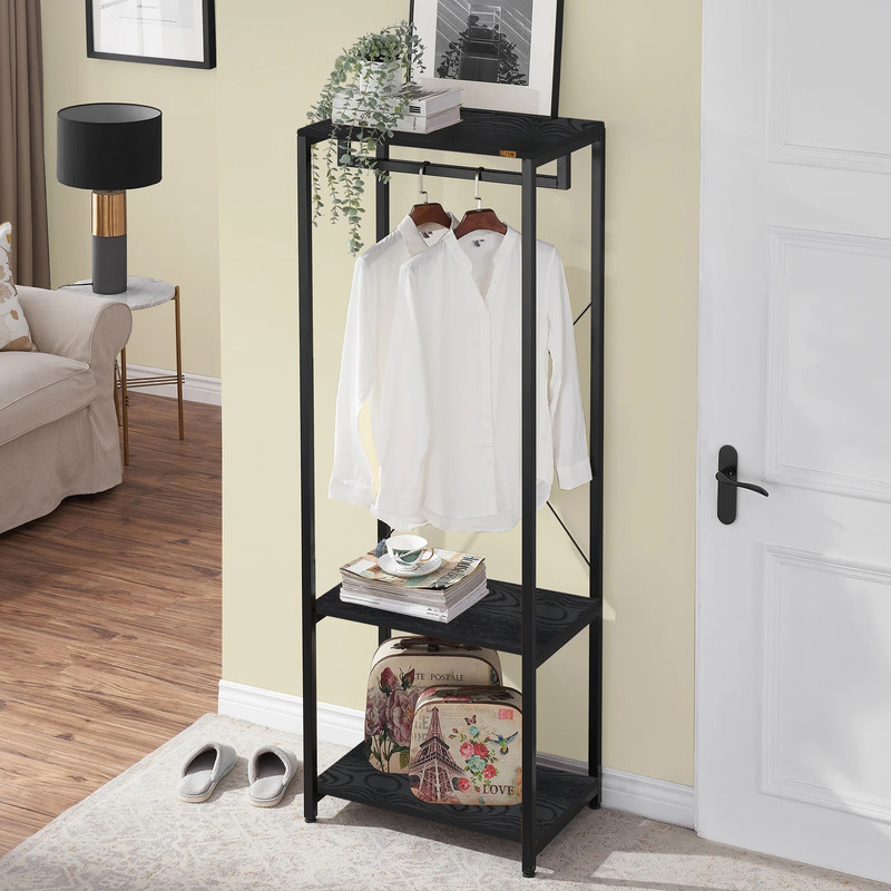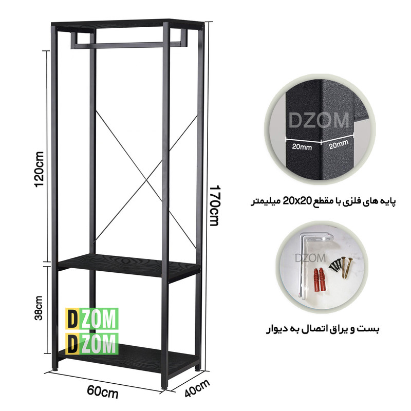 این محصول از پایه های فلزی با مقطع 20x20 میلیمتر و رنگ رویه الکترو با ی و دوام بالا ساخته شده است. همچنین پایه های پیچی، قابلیت تنظیم نسبت به سطح زمین را دارد تا بهترین تراز جهت جلوگیری از تکان خوردن را ایجاد نماید. صفحه محصول از جنس MDF درجه یک برجسته طرح چوب و به رنگ مشکی می باشد. این محصول با طول 60cm، عرض 40cm و ارتفاع 170cm عرضه می شود. به این نکته توجه شود که تنوع رنگ انتخابی کالا تنها مربوط به رنگ پایه های فلزی میباشد و محصول به صورت کاملا مونتاژ شده و آماده استفاده برای مشتریان ال می گردد. توصیه میشود جهت حفظ ایمنی و ثبات بیشتر، محصول در یک یا دو نقطه به دیوار پیچ گرد.(یراق اتصال داخل بسته بندی موجود است).