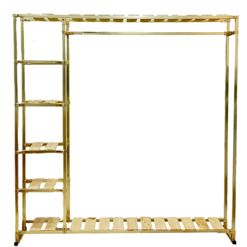 رگال لاکچری طلایی رنگ یک کالای با کیفیت و بسیار شیک برای استفاده در اتاق یا مغازه است ،که دارای فضای زیادی برای آویز لباس و طبقات برای کیف و کفش می باشد . این رگال به صورت جمع ال میشود که فضای کمی برای جابجایی بیرد و به سادگی قابل نصب می باشد ، همچنین برای مستاجران که امکان نصب کمد دیواری ندارند بسیار مناسب می باشد.