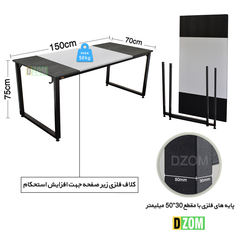 میز ت DZom مدل مونتاژی TLD_asm_150×70_Tri_BAW محصولی مونتاژی، سبک، شیک و در عین حال جذاب و کارآمد از سری تولیدات میباشد. این محصول بصورت سلف اسمبل (مونتاژی) تولید شده است. این میز حمل و نقل ان و هزینه حمل مقرون به صرفه ای دارد. این میز از پایه های فلزی با مقطع 50x30 میلیمتر و رنگ رویه الکترواستاتیک با ماندگاری و دوام بالا ساخته شده است. همچنین پایه های پیچی، قابلیت تنظیم نسبت به سطح زمین را دارد تا بهترین تراز جهت جلوگیری از تکان خوردن را ایجاد نماید. صفحه میز از جنس MDF درجه یک برجسته طرح چوب با ترکیبی از دو رنگ مشکی و سفید می باشد. این محصول با طول 150cm، عرض 70cm و ارتفاع 75cm عرضه می شود. به این نکته توجه شود که تنوع رنگ انتخابی کالا تنها مربوط به رنگ پایه های فلزی میباشد.