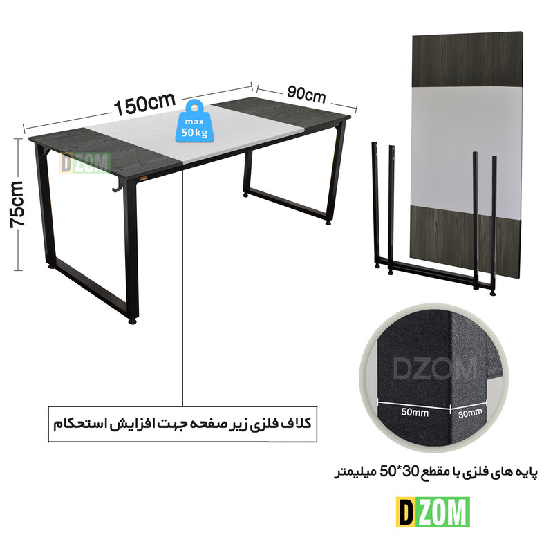 میز اداری DZom مدل مونتاژی TLD_asm_150×90_Tri_BAW محصولی مونتاژی، سبک، شیک و در عین حال جذاب و کارآمد از سری تولیدات میباشد. مشتری گرامی توجه نمایید محصولات برند (شماره ثبت 414013 اداره ثبت علائم تجاری) با کیفیت و بسته بندی اصلی تنها توسط فروشنده رسمی در دیجیکالا عرضه میشود، لطفاً از خرید کالای تقلبی از سایر فروشندگان خودداری فرمایید. این محصول بصورت سلف اسمبل (مونتاژی) تولید شده است. این میز حمل و نقل ان و هزینه حمل مقرون به صرفه ای دارد. این میز از پایه های فلزی با مقطع 50x30 میلیمتر و رنگ رویه الکترواستاتیک با ماندگاری و دوام بالا ساخته شده است. همچنین پایه های پیچی، قابلیت تنظیم نسبت به سطح زمین را دارد تا بهترین تراز جهت جلوگیری از تکان خوردن را ایجاد نماید. صفحه میز از جنس MDF درجه یک برجسته طرح چوب با ترکیبی از دو رنگ مشکی و سفید می باشد. این محصول با طول 150cm، عرض 90cm و ارتفاع 75cm عرضه می شود. به این نکته توجه شود که تنوع رنگ انتخابی کالا تنها مربوط به رنگ پایه های فلزی میباشد.