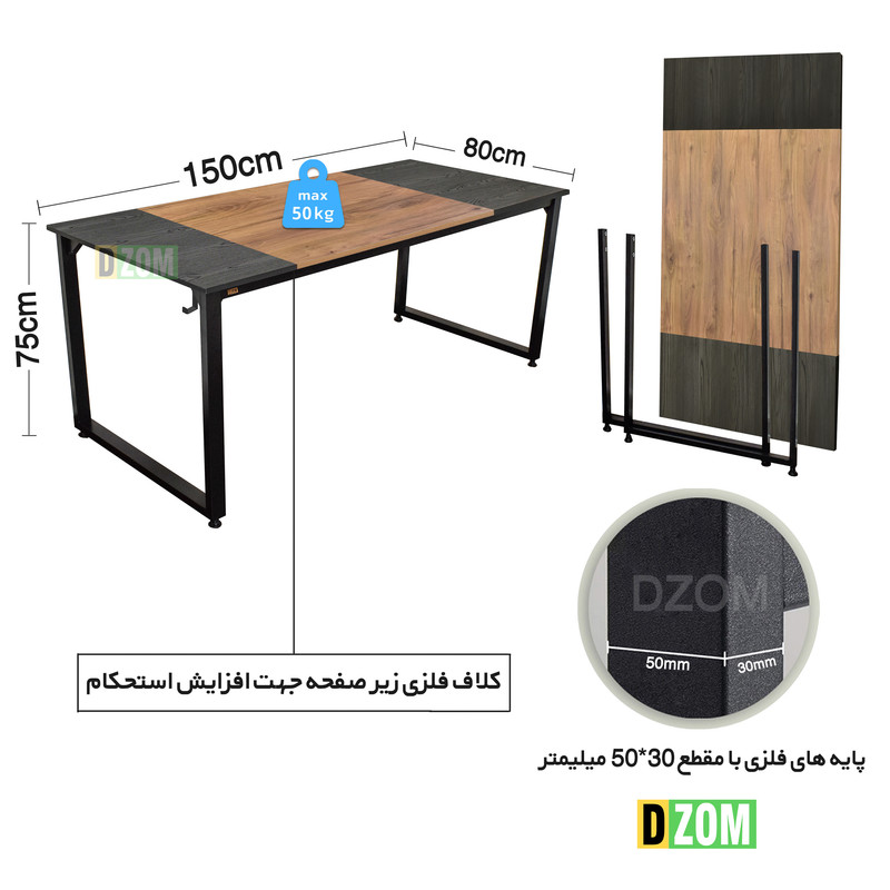 میز ت DZom مدل مونتاژی TLD_asm_160×80_Tri_BALIGHT محصولی مونتاژی، سبک، شیک و در عین حال جذاب و کارآمد از سری تولیدات میباشد. این محصول بصورت سلف اسمبل (مونتاژی) تولید شده است. این میز حمل و نقل ان و هزینه حمل مقرون به صرفه ای دارد. این میز از پایه های فلزی با مقطع 50x30 میلیمتر و رنگ رویه الکترواستاتیک با ماندگاری و دوام بالا ساخته شده است. همچنین پایه های پیچی، قابلیت تنظیم نسبت به سطح زمین را دارد تا بهترین تراز جهت جلوگیری از تکان خوردن را ایجاد نماید. صفحه میز از جنس MDF درجه یک برجسته طرح چوب با ترکیبی از دو رنگ مشکی و قهوهای روشن می باشد. این محصول با طول 160cm، عرض 80cm و ارتفاع 75cm عرضه می شود. به این نکته توجه شود که تنوع رنگ انتخابی کالا تنها مربوط به رنگ پایه های فلزی میباشد.