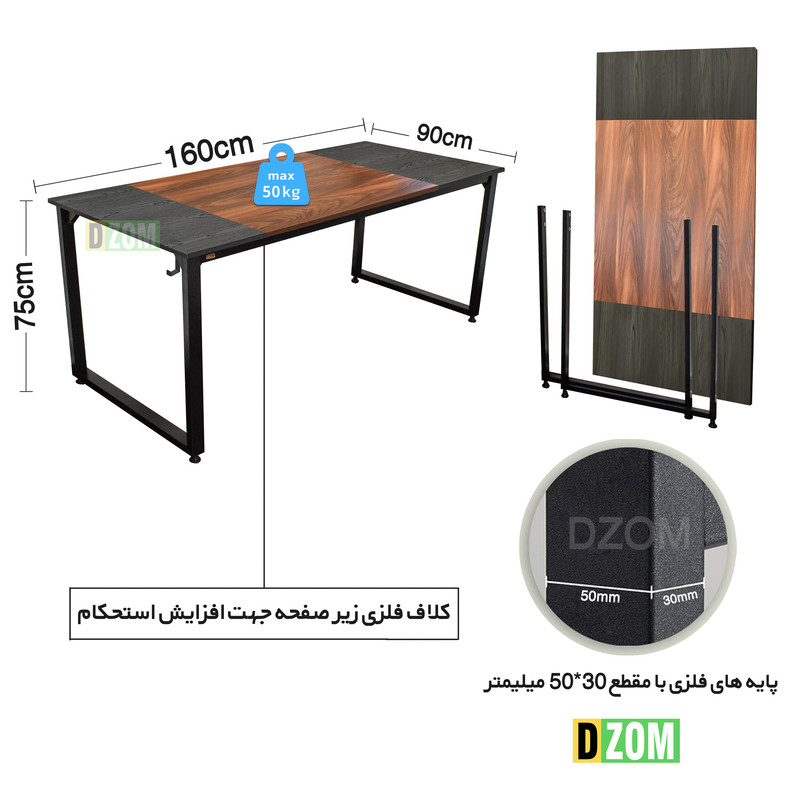 میز ت DZom مدل مونتاژی TLD_asm_160×90_Tri_BABRN محصولی مونتاژی، سبک، شیک و در عین حال جذاب و کارآمد از سری تولیدات میباشد. مشتری گرامی توجه نمایید محصولات برند (شماره ثبت 414013 اداره ثبت علائم تجاری) با کیفیت و بسته بندی اصلی تنها توسط فروشنده رسمی در دیجیکالا عرضه میشود، لطفاً از خرید کالای تقلبی از سایر فروشندگان خودداری فرمایید. این محصول بصورت سلف اسمبل (مونتاژی) تولید شده است. این میز حمل و نقل ان و هزینه حمل مقرون به صرفه ای دارد. این میز از پایه های فلزی با مقطع 50x30 میلیمتر و رنگ رویه الکترواستاتیک با ماندگاری و دوام بالا ساخته شده است. همچنین پایه های پیچی، قابلیت تنظیم نسبت به سطح زمین را دارد تا بهترین تراز جهت جلوگیری از تکان خوردن را ایجاد نماید. صفحه میز از جنس MDF درجه یک برجسته طرح چوب با ترکیبی از دو رنگ مشکی و قهوهای می باشد. این محصول با طول 160cm، عرض 90cm و ارتفاع 75cm عرضه می شود. به این نکته توجه شود که تنوع رنگ انتخابی کالا تنها مربوط به رنگ پایه های فلزی میباشد.