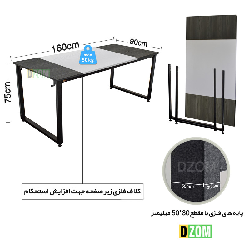 میز ت DZom مدل مونتاژی TLD_asm_160×90_Tri_BAW محصولی مونتاژی، سبک، شیک و در عین حال جذاب و کارآمد از سری تولیدات میباشد. مشتری گرامی توجه نمایید محصولات برند (شماره ثبت 414013 اداره ثبت علائم تجاری) با کیفیت و بسته بندی اصلی تنها توسط فروشنده رسمی در دیجیکالا عرضه میشود، لطفاً از خرید کالای تقلبی از سایر فروشندگان خودداری فرمایید. این محصول بصورت سلف اسمبل (مونتاژی) تولید شده است. این میز حمل و نقل ان و هزینه حمل مقرون به صرفه ای دارد. این میز از پایه های فلزی با مقطع 50x30 میلیمتر و رنگ رویه الکترواستاتیک با ماندگاری و دوام بالا ساخته شده است. همچنین پایه های پیچی، قابلیت تنظیم نسبت به سطح زمین را دارد تا بهترین تراز جهت جلوگیری از تکان خوردن را ایجاد نماید. صفحه میز از جنس MDF درجه یک برجسته طرح چوب با ترکیبی از دو رنگ مشکی و سفید می باشد. این محصول با طول 160cm، عرض 90cm و ارتفاع 75cm عرضه می شود. به این نکته توجه شود که تنوع رنگ انتخابی کالا تنها مربوط به رنگ پایه های فلزی میباشد.