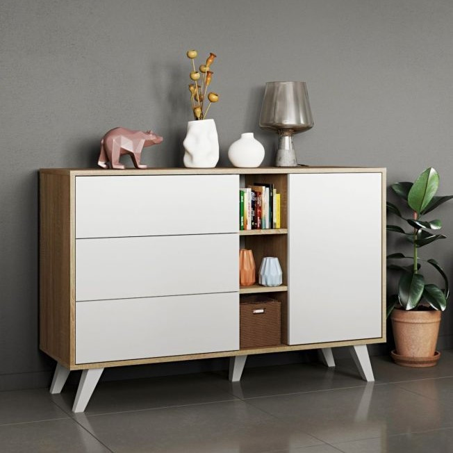 مدل 2694 یک محصول بسیارزیبا ، کاربردی و باکیفیت است. این محصول از ام دی اف درجه یک ساخته شده و یراق به کار رفته در این محصول بسیار باکیفیت است که خیال شما را از مرغوب بودن این محصول راحت میکند. این محصول شامل یک کمد سه قفسه و سه کشو است . درب های این محصول به وسیله مگنت بسیار باکیفیت و درجه یک باز میشود. پایه های چوبی این محصول در عین ظرافت و زیبایی ، بسیار مقاوم و باکیفیت است. به هنگام انتخاب رنگ دقت فرمایید، رنگ سفید مات به کار رفته در درب محصول ثابت است و رنگ انتخابی شما برای دیگر قسمت اعمال میگردد. هرگز محصولات ما را با محصولات ارزان ، که با نئوپان و ملامینه ساخته میشوند و کیفیت بسیار پایینی دارند مقایسه نکنید. محصولات ما از ام دی اف و یراق خارجی تولید میشوند و به همین دلیل سالیان سال زینت بخش منزل شما خواهند بود.