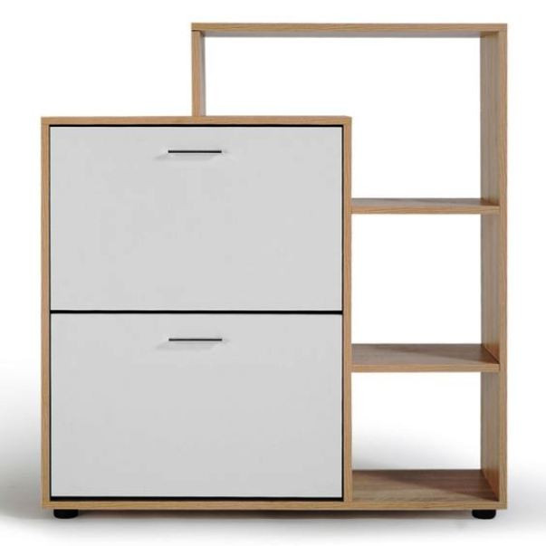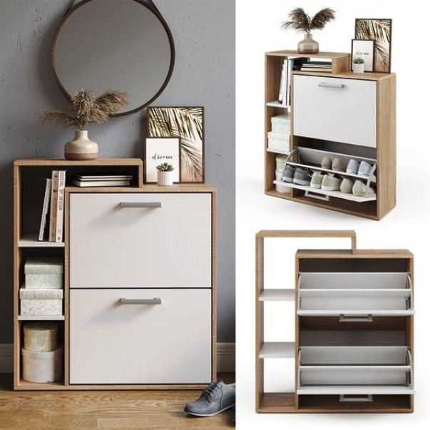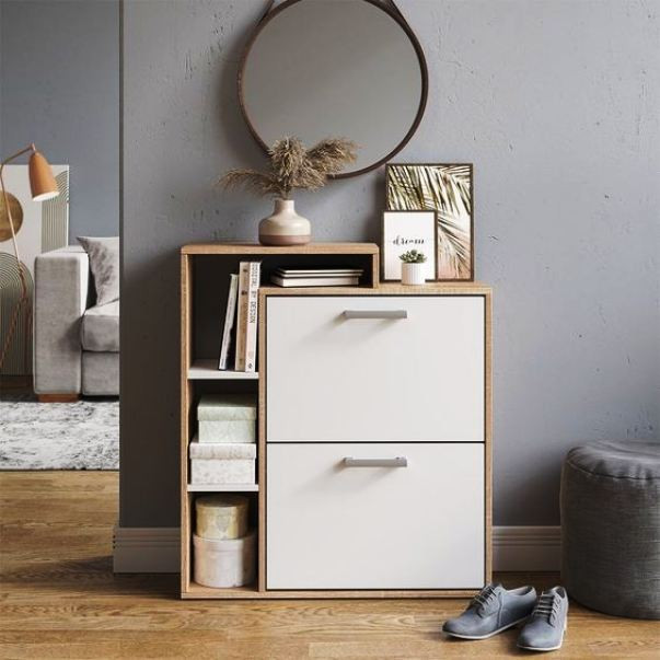 جاکفشی کم جا داشبوردی دو درب. جنس بدنه ام دی اف با کیفیت عالی است و نوارهای لبه PVC درجه یک هستند. اتصالات و لوازم جانبی مورد استفاده در آن، دارای بهترین کیفیت است. بسته بندی به صورت استاندارد انجام می شود. محصول بصورت کامل مونتاژ شده می باشد. ظرفیت 8-10 جفت کفش را دارد، همچنین دارای طبقه جهت استفاده برای کفش یا وسایل تزیینی می باشد. محصول بسیار زیبا و قابل استفاده در پذیرایی و راهروها است.