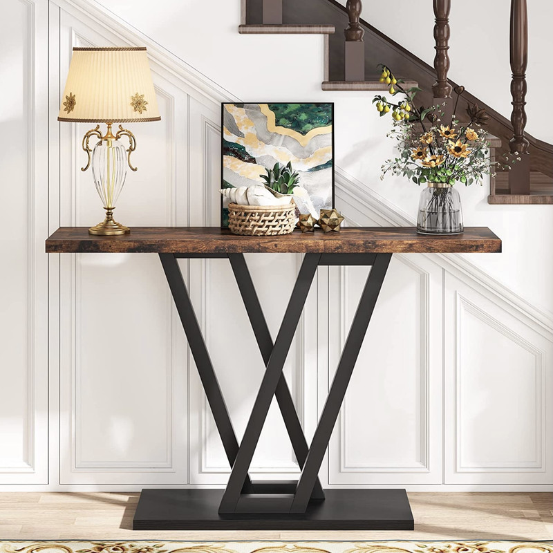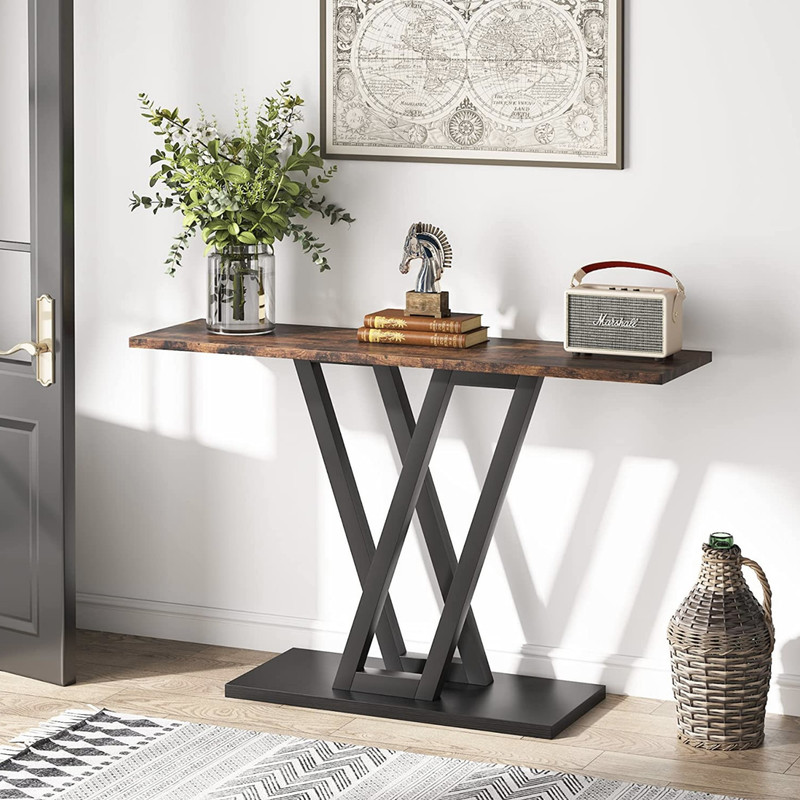 ترکیب محبوب اما نفیس از رنگهای فلزی مشکی و روکش یکپارچه سازی با سیستم عامل، این میز باریک را در هر فضایی، بهویژه فضاهایی که بر اساس سبکهای طراحی صنعتی ساخته شدهاند، به یک سبك روستيك تبدیل میکند. پایه فلزی منحصر به فرد: پایه مستطیلی با لوله های "V" برای تمایز. به لطف شخصیت تخیلی و التقاطی آن، وقتی هر کسی وارد فضای داخلی شما می شود، همه نگاه ها به این میز ورودی کوچک خواهد بود. همه کاره و کاربردی: می توانید از این پشت میز کاناپه برای نمایش لامپ ها و عکس های برجسته در اتاق نشیمن، میز کنسول برای ورودی برای مرتب نگه داشتن نامه ها و کلیدها یا میز راهرو برای نمایش دکوراسیون خود در راهرو استفاده کنید. این میز براى فضاهای کوچک باید بهترین انتخاب باشد. طراحی باریک اما میز جادار، یک پلت فرم جذاب برای نمایش اقلام شما مانند کتاب، لامپ، عکس، گلدان و غیره فراهم می کند.