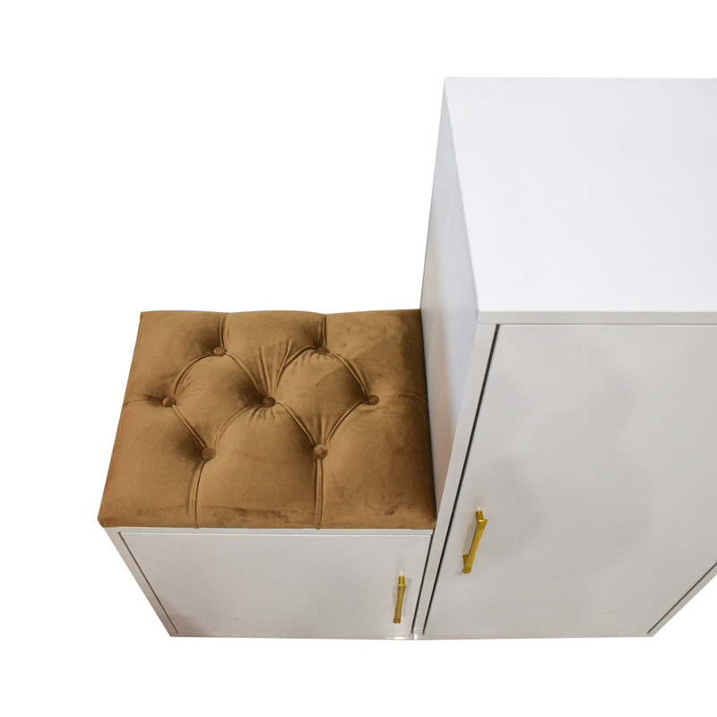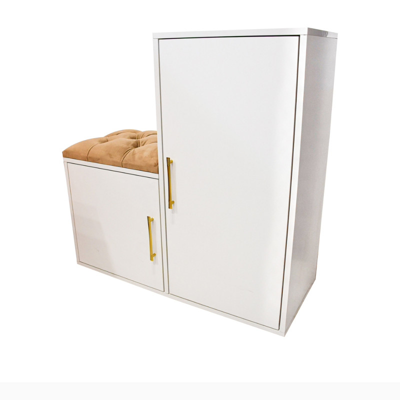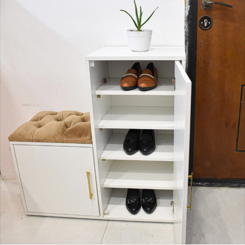 جاکفشی مدل آلما 402 طراحی شده برای 16 جفت کفش همراه با نشیمن با رویه کوبی مبلی چستر(لمسه) امکان این را فراهم میکند تا در زمان استفاده از هر گونه کفش از نشیمن این مدل به راحتی استفاده کنید. رنگ چوب بکار رفته در این مدل سفید بوده و برای تمامی تنوع های رنگی ثابت است. از طرفی تنوع متنوع رنگ پارچه مبلی برای این مدل این امکان را فراهم میکند تا با فضای منزل شما به راحتی ست شود!! در این مدل جاکفشی از درب با لولا های آرام بند استفاده شده و پایه های 1/5 سانتی مخفی جلوه زیبایی به این مدل بخشیده است!!