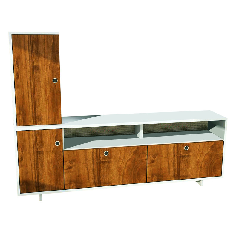 میز تلویزیون L810 یک میز زیبا با ارتفاع بالا با چهار درب بازشو میتواند تمامی شلوغی های اطراف نمایشگر را مخفی بکند. میز در طرح ال به صورت دوتکه مجزا طراحی شده است که به راحتی میتوانید اتصالات آن را باز یا یسته کنید. در این میز با توجه به اکسسوری های مورد نیاز اندازه هایی استاندارد آن تعریف شده است. در واقع دستگاه های جانبی نمایشگر مثل گیرنده دیجتال و دستگاه دی وی دی و ... را میتوان در آن تعبیه کرد. لازم به ذکر است دربهای این میز در رنگ با کنتراست بالای رنگ اصلی کار شده است به عنوان مثال میز مشکی با درب طوسی، یا میز قهوه ای سوخته با درب کرم و ... کار شده است.