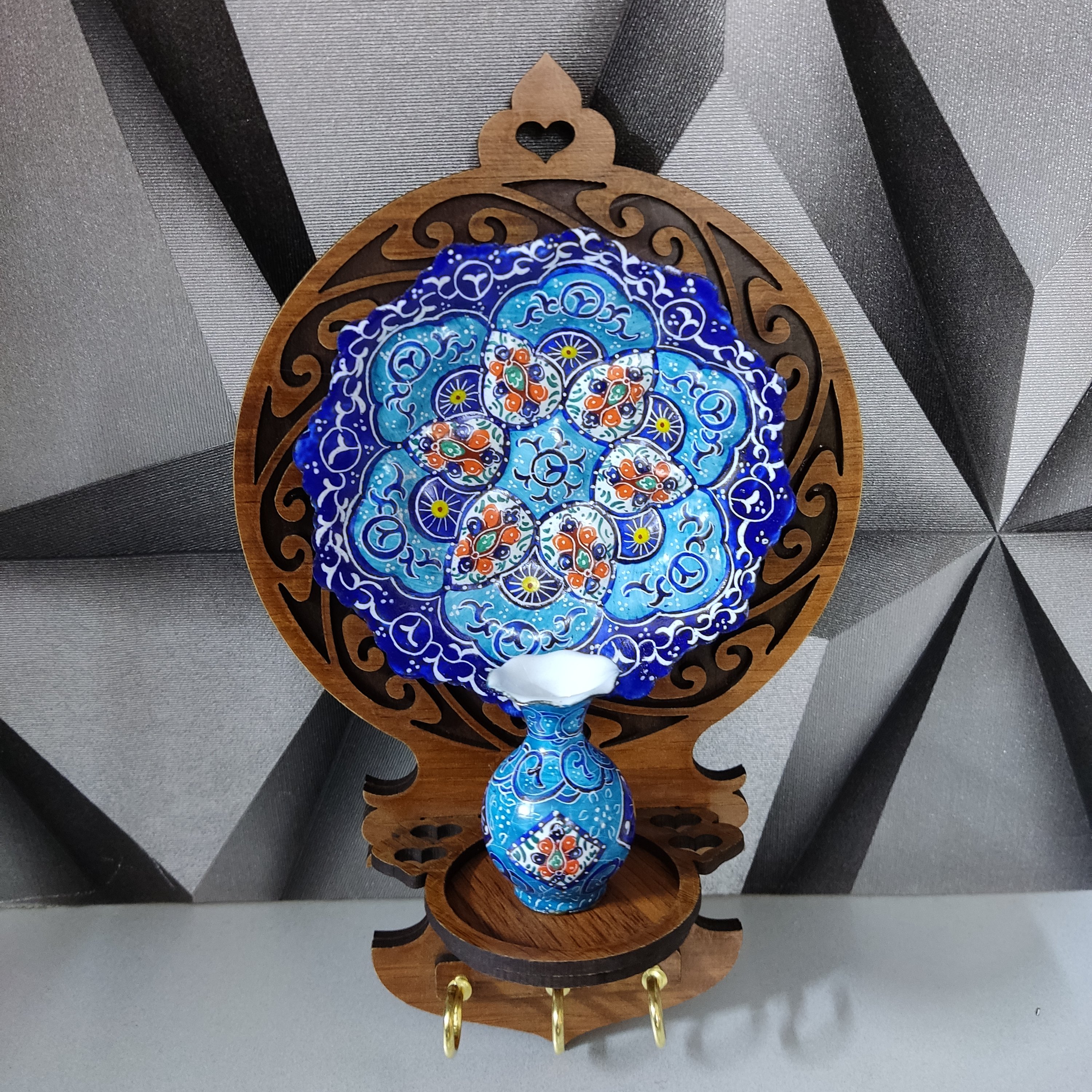 اطلاعات محصول 🔷جاکلیدی به همراه بشقاب و گلدان 🔷نام رشته هنری: میناکاری روی مس 🔷جنس کار: ورق مس 🔷شهر محل فعالیت: اصفهان 🔷کیفیت محصول: ظروف میناکاری از زیرساخت مس ساخته شده که لعاب شده وبعداز لعاب نقاشی شده و در دمای ۹۰۰ درجه کوره شده تا رنگش براق و ثابت بشه. ✅ظروف میناکاری قابل استفاده قابل شستشو وضدخش هستند. ✅فروش بصورت عمده و جزیی آماده ارائه همکاری با ارگان ها و شرکت ها وفروشگاه ها با بهترین قیمت و بالاترین کیفیت ✅حمایت از تولید ایرانی وهنرمندان ایرانی با خرید محصولات ایرانی ✅ارسال به کلیه شهرها و کشورها