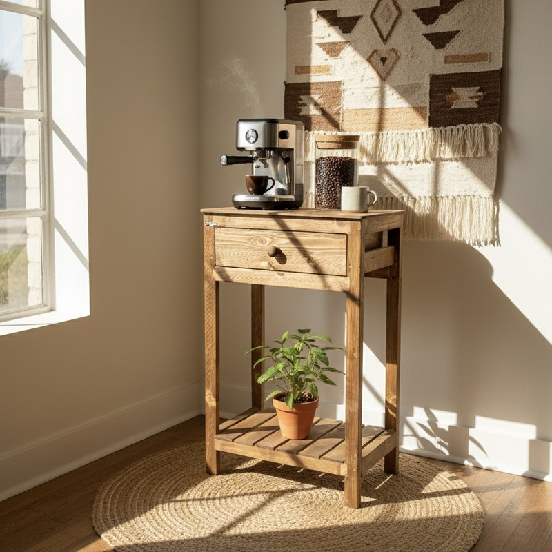 این کنسول دارای یک طبقه کشو و یک طبقه در قسمت پایین و مناسب استفاده در منزل و یا محیط کار جهت قرار گیری اع دستکاه های قهوه ساز و یا چای ساز که نظم خاصی به محیط مورد نظر شما می دهد، این کنسول کافی بار ساخته شده از چوب طبیعی روس می باشد ،
