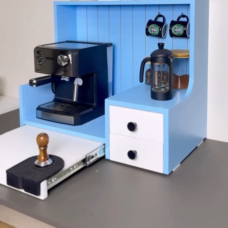 این کافی بار رومیزی یک استند شیک و کاربردی است که برای نگهداری و سازماندهی وسایل مرتبط با تهیه قهوه طراحی شده است. این مدل دارای محفظهای مناسب برای قرار دادن دستگاه اسپرسوساز، کشوهای کوچک برای نگهداری قاشق، کپسول قهوه یا دیگر لوازم جانبی، و قفسههایی برای لیوان، فنجان و سایر ملزومات نوشیدنی است. طراحی چوبی آن با رنگ گرم و روکش طبیعی، جلوهای لوکس و دلنشین به فضای آشپزخانه یا کافیشاپهای خانگی میبخشد. همچنین، وجود قلابهایی برای آویزان کردن فنجانها و قفسههای کوچک برای قرار دادن قهوه، چای و ادویهها، باعث میشود همه چیز در دسترس و منظم باشد. این استند برای عاشقان قهوه که به زیبایی و نظم اهمیت میدهند، یک گزینه ایدهآل است.