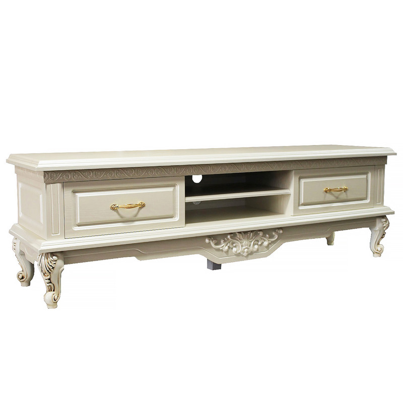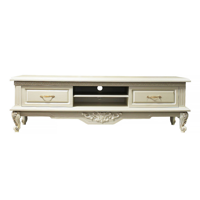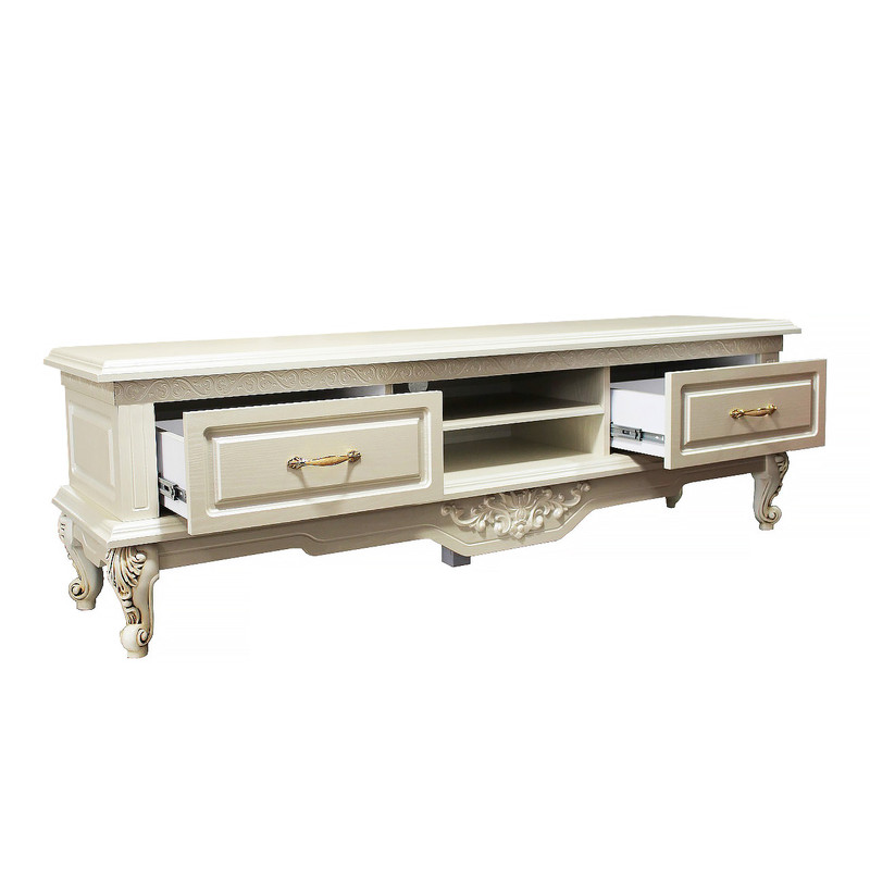 میز تلویزیون مدل Classic-160 صدفی یک میز تلویزیون کرم روشن کلاسیک است که طول آن 160 سانتیمتر، عرض آن 40 سانتیمتر و ارتفاع آن 50 سانتیمتر است. جنس این میز ام دی اف وکیوم(ام دی اف روکش دار) است و جنس پایه های آن پلیمر فایبر گلاس فشرده ABS است. این مدل دارای دو کشوی دستگیره دار است که دستگیره های زیبایی بر روی در کشوهای آن نصب شده است و دارای دو محفظه برای قرار دادن دستگاه های جانبی تلویزیون است. بر روی قاب پاخور پایین میز طرح گل دیده می شود و بر روی زهوار بالایی آن نقش و نگار دیده می شود.