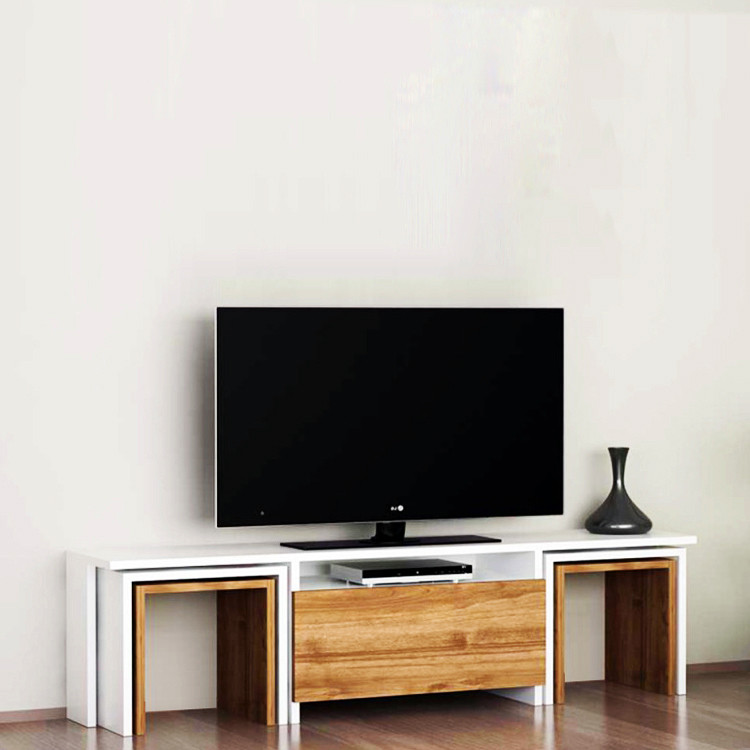میز تلویزیون مدل DLF34L طراحی شده برای فضاهای کوچک با جای دادن چهار عدد میز عسل خوری در زیر خود برای خانه های کمجا مناسب است. از این چهار عسلی هر تعدادی که نیاز داشته باشید را می توان از زیر میز نمایشگر بیرون کشید و بعد از استفاده سپس در جای خود قرار داد و فضایی باز در پذیرایی داشته باشید. میز تلویزیون مدل DLF34L از جنس لترون درجه یک ساخته شده و برای خرید جنس ام دی اف می توانید دیگر محصولات دلفان دکور را ببینید. از آنجا که دارای باکس و یک عدد درب داشبردی نسبتا بزرگ است می توانید وسایل مورد نیاز را در آن جای داد. لازم به ذکر است میز در حالت تک رنگ ارائه می شود و فقط در صورت انتخاب گزینه چند رنگ مطابق عکس رنگ سفید و گردویی با هم ترکیب می شوند. اطلاعات دقیق ابعادی در بین تصاویر محصول وجود دارد. لطفا برای انتخاب رنگ مورد نظر حتما سمپل رنگ در تصاویر را بررسی کنید.