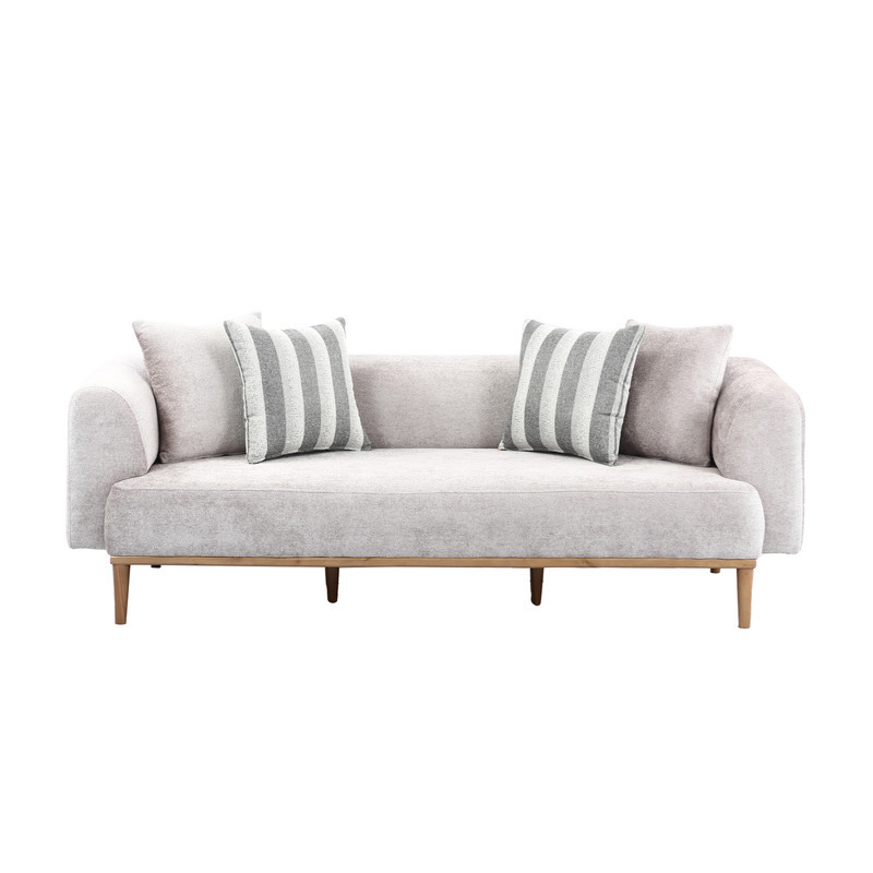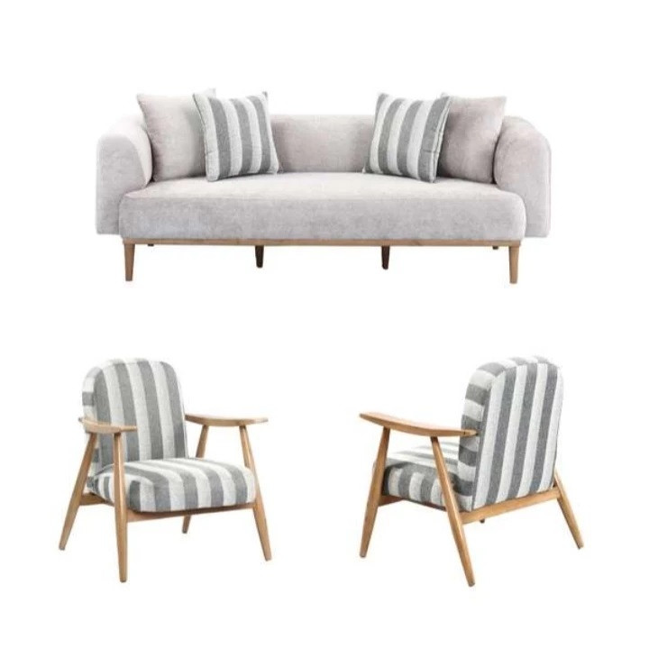 ست 5 نفره ی مدرن شامل یک کاناپه سه نفره دو مبل تک نفره چوبی با جدید ترین طراحی و با استفاده از بهترین متریال مصرفی ارائه می شود.کلاف استفاده شده در ساخت این محصول تماما چوب مرغوب و مستحکم روس می باشد.در پایه های این محصول از چوب خودرنگروس استفاده شده که علاوه بر نمای چوبی زیبا دوام بالایی نیز دارد.اسفنج مصرفی در قسمت نشیمن محصول اسفنج 35 کیلویی ویژه که مرغوب ترین نوع اسفنج است استفاده شده که نشیمنی راحت و با دوام را به ارمغان می اورد.پارچه ی انتخاب شده برای این محصول پارچه ی مرغوب بوده که در سبک مدرن کاربرد زیادی دارد که ضمن زیبایی با ویژگی قابلیت شست و شوی انتخابی مناسب محسوب می شود. در مجموع این محصول با نمایی ساده و جذاب,نشیمنی راحت و کیفیتی بالا,انتخابی ایده ال برای دوستداران مبلمان مدرن می باشد