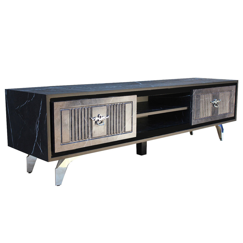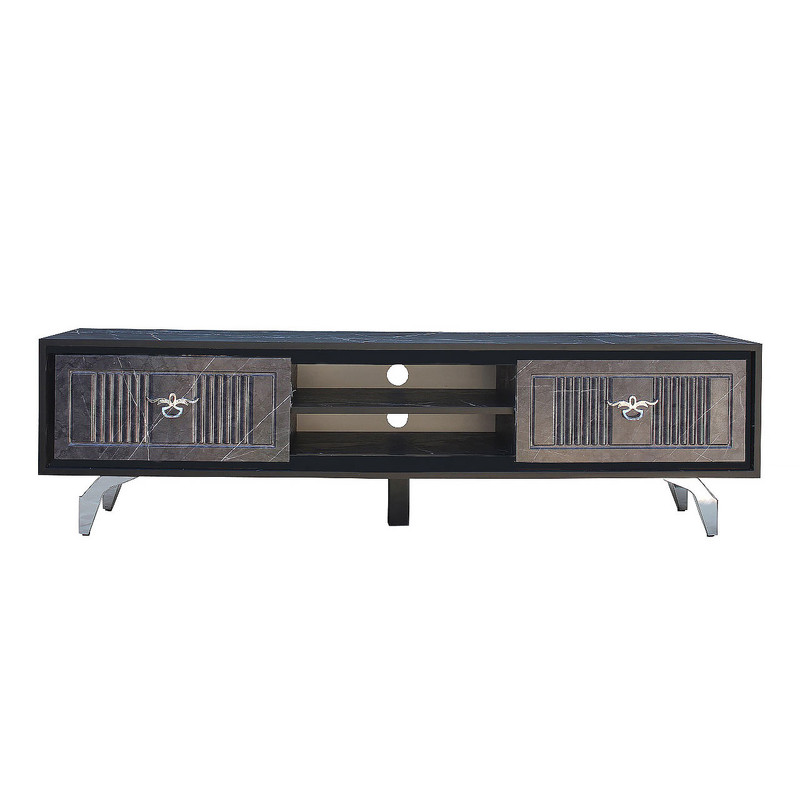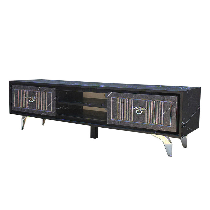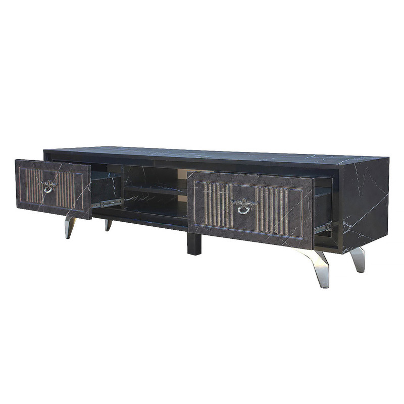 میز تلویزیون مدل 5060 MARBLE BLACK یک میز تلویزیون مشکی سبک مدرن است که طول آن 160 سانتیمتر، عرض آن 40 سانتیمتر و ارتفاع آن 50 سانتیمتر است. جنس بدنه این میز ام دی اف و جنس پایه های آن فلزی (از جنس کروم) به رنگ استیل است. رنگ زمینه این میز مشکی است و در داخل آن رگه های مرمری سفید به چشم می خورد. در نگاه اول به نظر می رسد جنس میز سنگی است، در حالیکه اینطور نیست و روکش وکیوم ام دی اف تلویزیون دارای طرح سنگ است. این میز دارای دو کشوی دستگیره دار است که بر روی آنها دستگیره های فلزی زیبایی که هم رنگ پایه های میز است کار شده است و در وسط میز هم دو محفظه جهت قرار دادن دستگاه های جانبی تلویزیون وجود دارد.