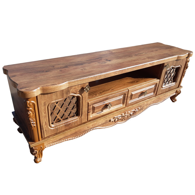 میز تلویزیون مدل ME140 با طول 140 سانتیمتر یک میز نسبتا بزرگ است. این میز تلویزیون از MDF با روکش وکیوم با طرح چوب ساخته شده شده که جلوه بسیار خوبی به آن بخشیده است. پایههای پلاستیکی هماهنگی بسیار خوبی با بدنه دارند و ارتفاع کلی میز را به 48 سانتیمتر می رسد . در سمت راست و چپ این میز تلویزیون دو کمد کوچک دستگیرهدار آینه کاری شده قرار گرفته و در وسط میز نیز دو کشو وجود دارد و تعادل خوبی به میز بخشیده است. یک تکه بودن این میز جابهجایی آن را کمی مشکل کرده اما در عوض استحکام بسیار بالایی دارد و با اطمینان میتوانید هر نوع تلویزیونی را روی آن قرار دهید. میز تلویزیون مدل ME140 طراحی بسیار ساده و کلاسیکی دارد و به راحتی با اکثر مبلمانهای خانگی هماهنگ میشود.