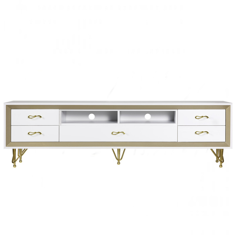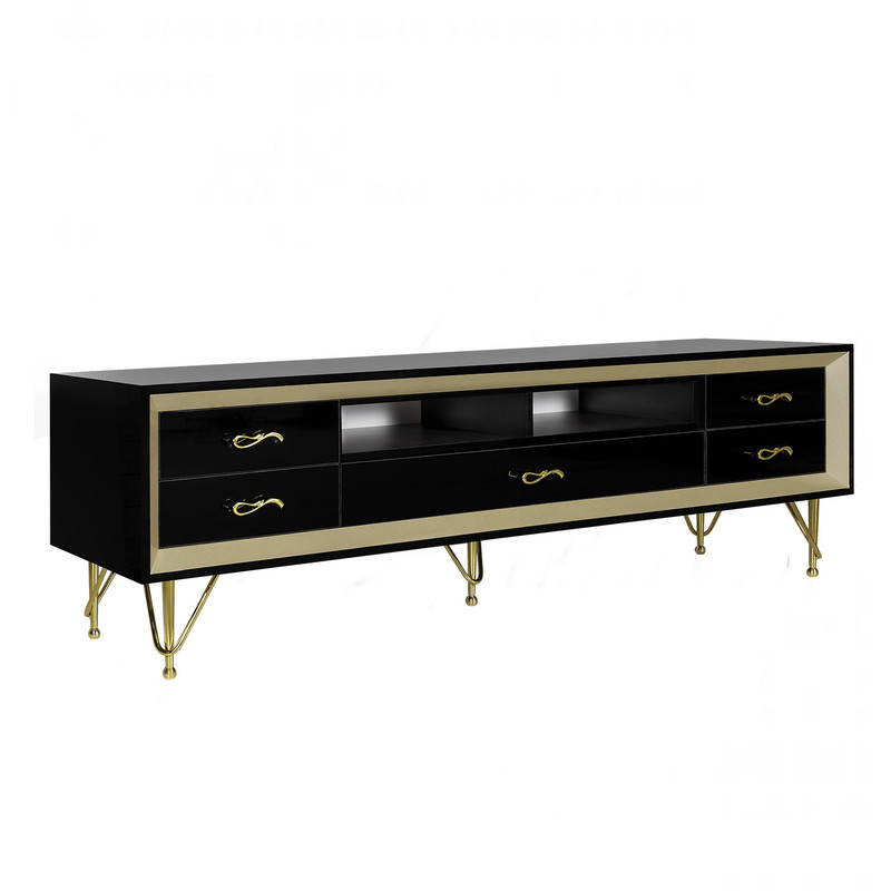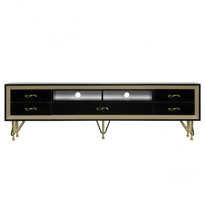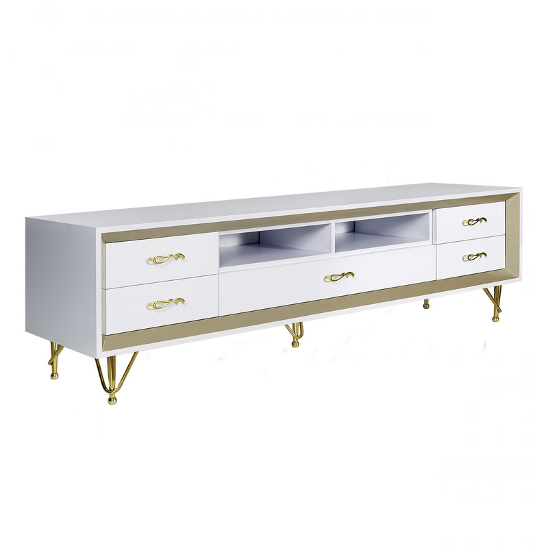میز تلویزیون مدل MT یک میز تلویزیون سایز بزرگ است که با طول 180 سانتیمتر، عرض 40 سانتیمتر و ارتفاع 45 سانتیمتر تولید شده است. این میز تلویزیون در دسته میز تلویزیون های سبک مدرن قرار دارد و از جنس ام دی اف- هاس ساخته شده است و دارای نمای براق است. دورتادور قسمت جلویی این میز حاشیه طلایی رنگی به صورت تو رفتگی کار شده است که باعث زیبایی ظاهری بسیار زیاد این میز شده است. پایه های این میز TV هم از جنس فلزی سه شاخه و به رنگ طلایی است. 3 کشوی دستگیره دار که با دستگیره های طلایی زیبا تزئین شده است، بر زیبایی میز افزوده است. در بالای کشوی پایینی دو جایگاه لوازم سرگرمی وجود دارد که می توانید دستگاه های جانبی تلویزیون را داخل آنها قرار دهید.