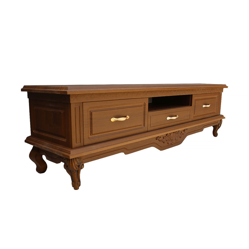 میز تلویزیون مدل NEW-CLASSIC-160-2 یکی از انواع مدل های سبک کلاسیک است که طول آن 160 سانتیمتر، عرض(عمق) آن 40 سانتیمتر و ارتفاع آن 50 سانتیمتر است. جنس بدنه این میز ام دی اف وکیوم(ام دی اف روکش دار) و جنس پایه های آن چوبی است. روی پایه های این میز منبت کاری و رنگ آمیزی شده است و بر روی قاب پاخور پایین آن طرح گل کار شده است. این مدل دارای سه عدد کشوی دستگیره دار و یک محفظه برای قرار دادن دستگاه های جانبی تلویزیون است.