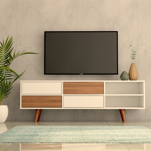 کد TS006 میزتلویزیون مقاوم و به شدت خوشساختی است. همچنین ارتفاع 35 سانتیمتری آن استاندارد و متناسب با حالت قرار گرفتن افراد حین تماشای تلویزیون طراحی شده است. این میز دارای چهار کشو و دو باکس با ابعاد کاربردی است.کشوها فضای لازم برای قرار دادن انواع لوازم جانبی مانند دیسکها، عینکهای سهبعدی و سایر وسایل را فراهم میکند. طبقات باکس بدون درب این محصول هم برای قرارگیری پخشکنندهها ایده آل هستند. جنس بدنه این میز تماماً از MDF با کیفیت است .پایه ها از جنس چوب روس مقاوم و ضدلغزش است.
