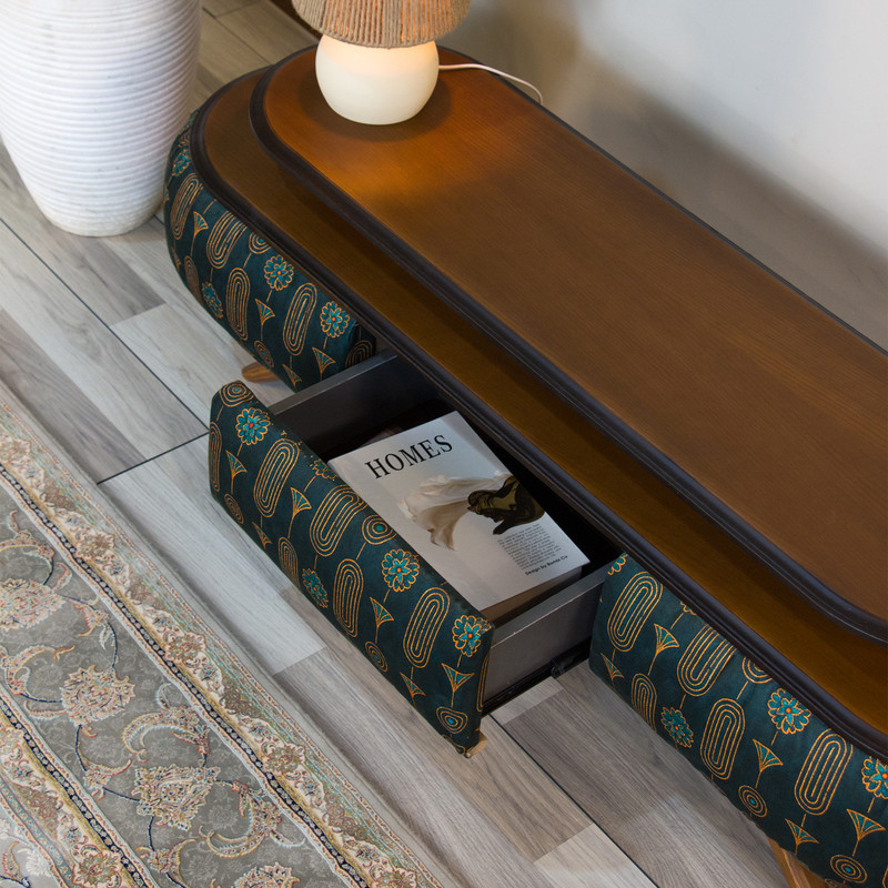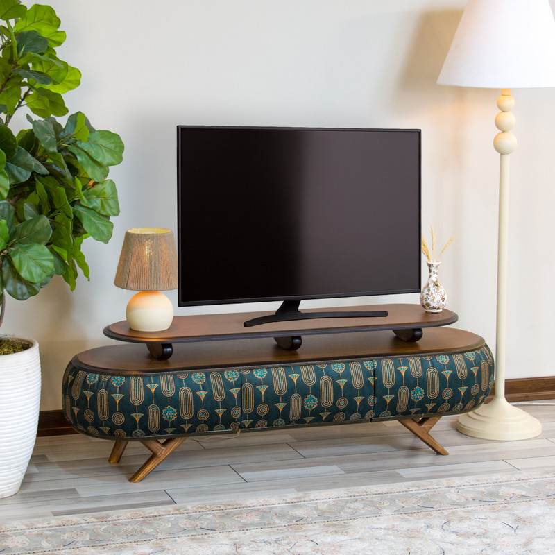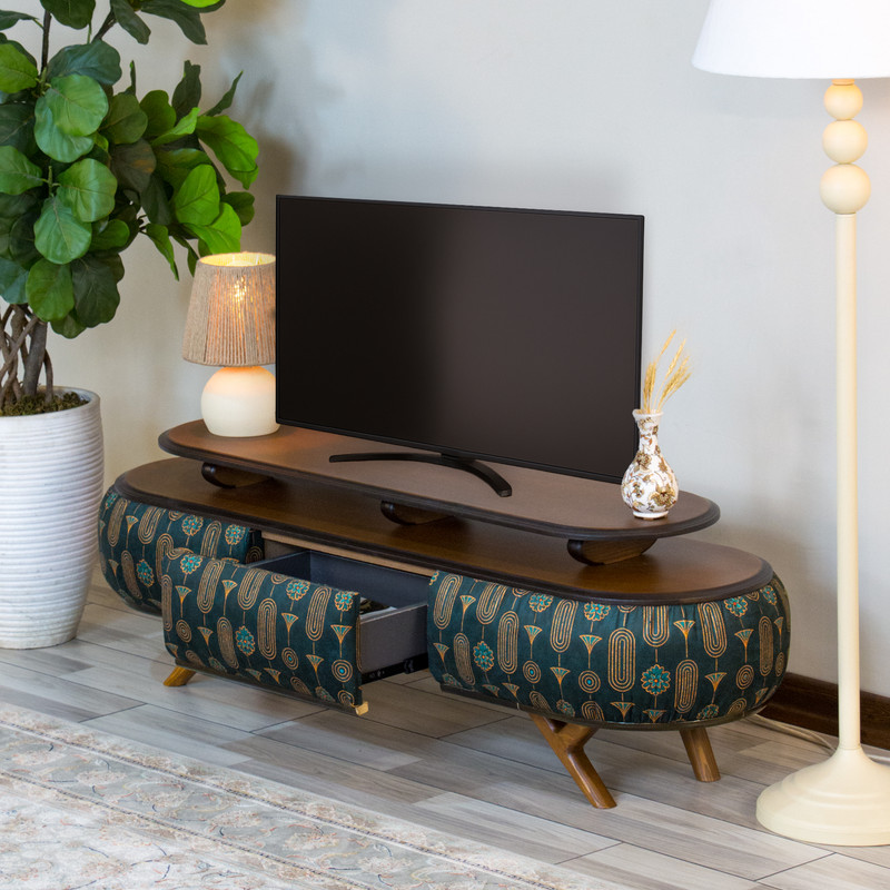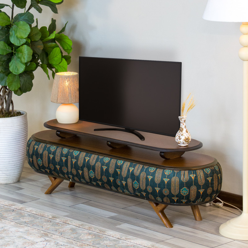 وقتی هنر ی در کنار سلیقهی مدرن قرار میگیرد، حاصلش اثریست همچون میز تلویزیون نقش آکام چوب طرح آپادانا — ترکیبی از اصالت، آرامش و شکوه در قلب خانهی شما. پارچهی مخملی با زمینهی سبز تیره و نقوش طلایی و فیروزهای برگرفته از معماری باشکوه هخامنشی، همانند تابلویی زنده بر بدنهی چوبی این میز نشسته است. این طرح چشمنواز با هر نور و زاویهای جلوهای تازه پیدا میکند؛ گویی در بافت آن ردپایی از تاریخ و هنر نهفته است. در طراحی این میز، ظرافت و عملکرد در کنار هم قرار گرفتهاند. سطح بالایی برای قرارگیری تلویزیون تا ۵۰ اینچ مناسب است و فرم کشیده و نرم بدنه باعث میشود فضای اتاق وسیعتر و منظمتر دیده شود. یک کشوی مخفی با ریلهای روان، نظمدهندهای کاربردی برای کنترلها، کابلها و وسایل کوچک روزمره است. در پشت بدنه نیز باکس مخصوص محافظ برق و سیمها تعبیه شده تا هیچ سیمی در دیدرس نباشد و فضای اطراف تلویزیون همیشه مرتب بماند. پایههای اریب چوبی، استحکام و ثبات میز را تضمین کردهاند و در عین حال با ظرافت طراحیشان، هماهنگی چشمنوازی میان سنت و مدرنیته پدید آوردهاند. میز تلویزیون آپادانا نه تنها محلی برای قرارگیری تلویزیون، بلکه المانی هنری برای دکوراسیون خانه است؛ جایی که زیبایی، کارایی و اصالت در کنار هم معنا مییابند.