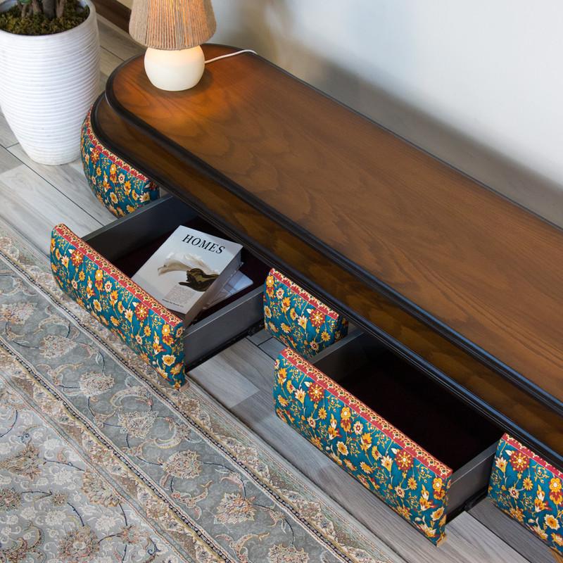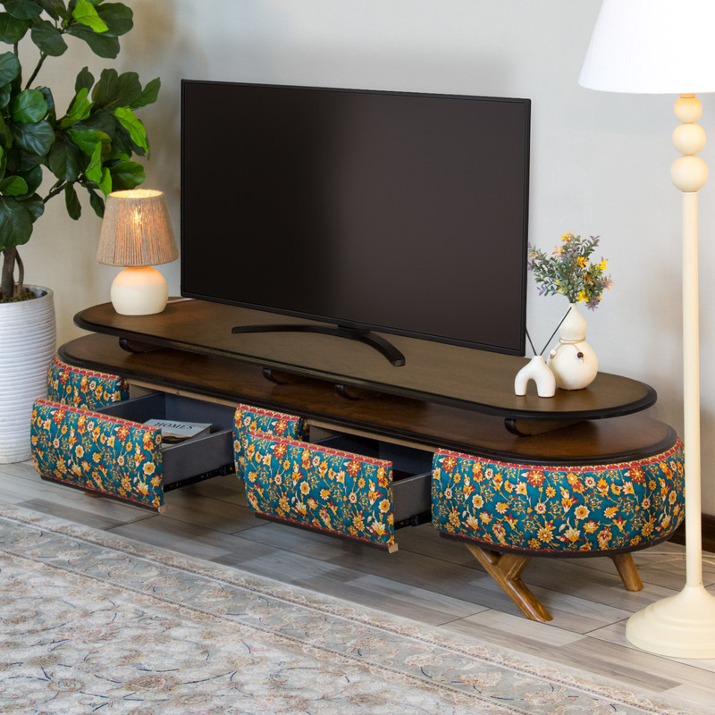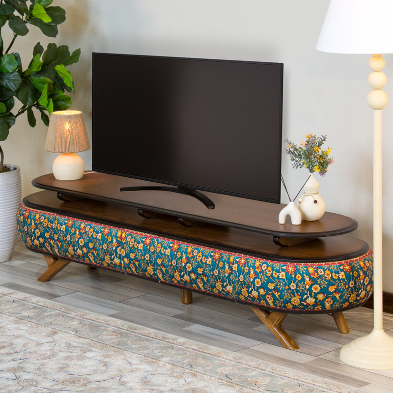 در دل هر خانهای نقطهای وجود دارد که نگاهها ناخودآگاه بهسوی آن میچرخد؛ جایی که تلویزیون قرار دارد و لحظات آرامش، فیلم و گفتوگو در اطرافش شکل میگیرد. میز تلویزیون نقش طرح قمصر سایز ۱۹۰، طراحی شده تا این نقطه را به زیباترین قاب از خانهی شما تبدیل کند. پارچهی مخملی با نقوش اصیل ی، برگرفته از گلهای رنگارنگ قمصر کاشان، در کنار فرم بیضی و نرم بدنه، جلوهای شاعرانه و در عین حال مدرن به فضا میبخشد. این طرح با رنگهای گرم طلایی و فیروزهای، حس شادی و طراوت را در اتاق نشیمن زنده میکند و هماهنگی دلانگیزی با مبلمان چوبی و پارچهای دارد. در نگاه اول، خطوط روان و طراحی هماهنگ پایهها با بدنه، جلوهای سبک و متوازن ایجاد کردهاند؛ اما در دل این ظرافت، عملکردی هوشمند پنهان است. دو کشوی مخفی با ریلهای نرم و بیصدا، فضایی کاربردی برای نگهداری کنترلها، لوازم جانبی، کتاب یا وسایل پذیرایی سبک فراهم میکنند. در پشت بدنه نیز باکس مخصوص سیم و محافظ برق تعبیه شده تا نظم ظاهری تلویزیون و وسایل صوتیتصویری حفظ شود. این میز با طول ۱۹۰ سانتیمتر برای تلویزیونهای بزرگتر از ۶۰ اینچ طراحی شده و ترکیب چوب طبیعی با پارچهی خاصش، حس گرما، اصالت و زندگی را به خانه میآورد. میز تلویزیون قمصر نهفقط یک وسیلهی کارآمد، بلکه نشانهای از سلیقهی زیباپسند و ترکیبی از هنر، کارایی و آرامش در یک قاب است.