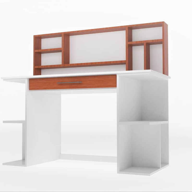 میز تحریر علاوه بر تقسیم بندی پایه ها شامل یک کتابخانه در قسمت بالا میز هست و امکان چیدمان حداکثری را به شخص میدهد،عرض 25 سانتی پایه ها استحکام قابل قبولی به میز داده واز لق زدن آن جلوگیری میکند .