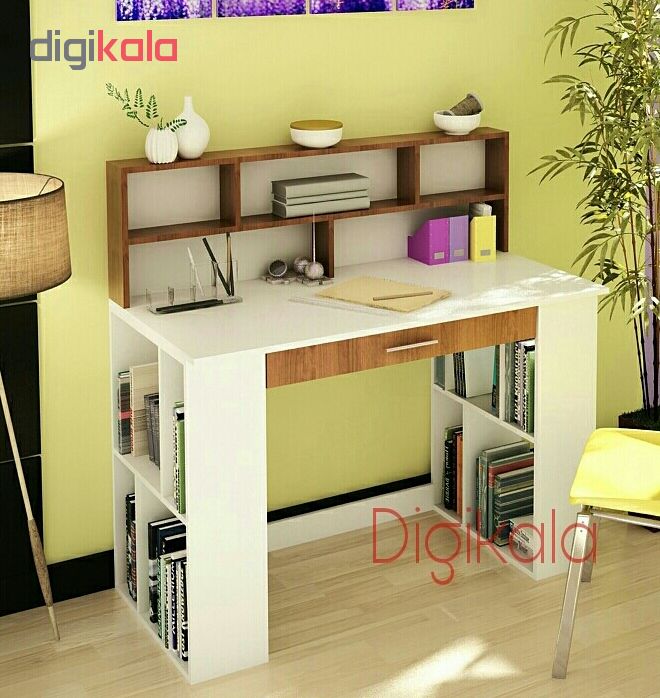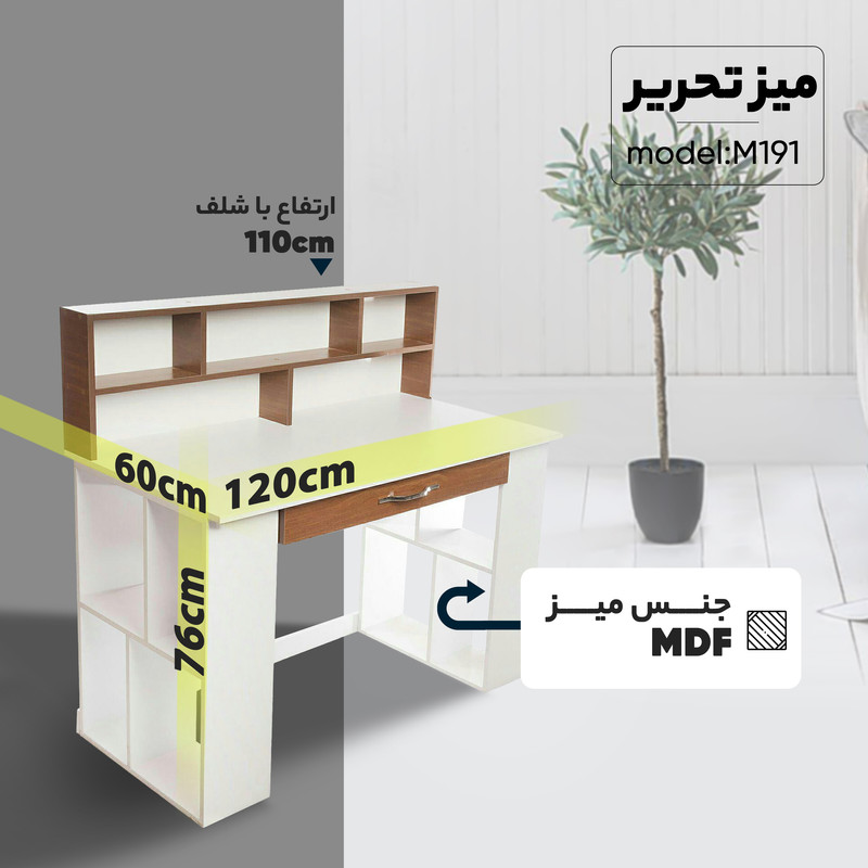 میز تحریر مدل M191 از مرغوبترین نوع mdf ضدخش تولید شده است که همین امر باعث ی بالا و مقاوم بودن آن میشود. اندازهی میز 60 در 120است که محیط کافی را برای قرار دادن کتاب و وسایل را برایتان فراهم میکند. این میز با عرض 20 سانت فضای مناسب و امنی را برای قراردادن کتابها ارائه میدهد. طراحی بدنه به گونهای ایت که اگر میز را در گوشهی اتاق هم قرار بدهید باز هم از هر دو سمت به میز و کتابخانه دسترسی کامل خواهید داشت. کشوی 10 سانتی تعبیه شده در زیر صفحه میز با ریل¬های سه زمانه ساچمهای فضای مناسبی رو برای قرار دادن وسایل ضروری برایتان ایجاد کرده است. همچنین دستگیره این کشو با استایل مدرنی که دارد زیبایی خاصی به نمای کلی میز تحریر شما بخشیده است. در نهایت طاقچه دو طبقه این محصول که بر روی سطح میز نصب شده این امکان رو به شما میهد تا بسیار راحتتر وسایل بر روی میز را منظم کرده و از شلوغی بیش از حد صفحه میز جلوگیری کنید. این طاقچه دو طبقه با ارتفاع 35 سانت و عمق 12 سانت یک فضای بسیار کاربردی برای قرار دادن وسایل ریز و درشت و کاربردی شما خواهد بود. جنس بدنهی این طاقچهها مانند بقیه قسمتهای این محصول از mdf درجه یک تولید شده و دیواره پشتی آن با فیبر سفید رنگ با ضخامت 3 میلیمتر پوشانده شده است.