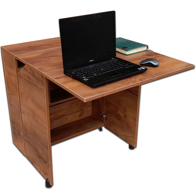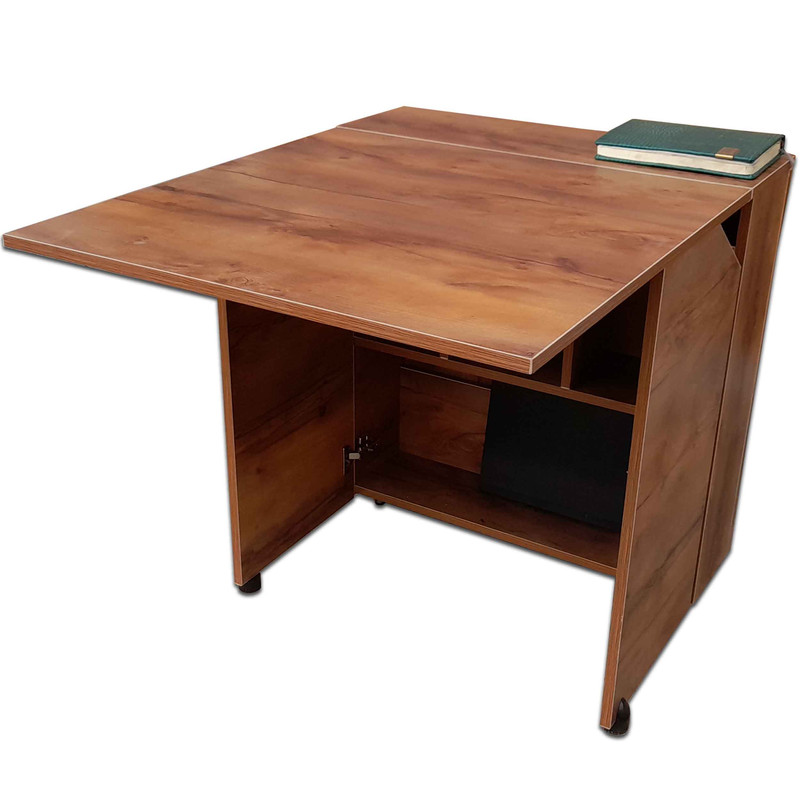 میزهای تاشو از جمله تجهیزات بسیار پر طرفدار و محبوب در بین اکثر اف و خانه ها محسوب میشوند دلیل آن هم این است که علاوه بر باز گذاشتن دست صاحب خانه در نوع چیدمان منزل ، به خاطر خاصیت جمع شوندگی آن پس از استفاده میتوان آن را جمع ، و به گوشه ای هدایت نمود. بنابراین میتوان از فضای منزل که معمولا خاده ها با کمبود آن مواجه هستند بهترین استفاده ممکن را برد و به همین دلیل میز های تاشو به عن یک ترفند هوشمندانه، برای مدیریت فضای منزل قلمداد شده و قابلیت بسیار بالایی را در سازگاری با فضاهای کم از خود نشان می دهند. محصول فوق جزء میزهای مدرن بوده و در زیر آن دارای چرخهایست که علاوه بر اینکه دارای استحکام و ثبات مناسب است ،جابجایی آن را بسیار تسهیل کرده است .داخل آن دارای فضای کابینتی مناسب برای جادادن کتاب و یا ظروف بوده و دارای دو درب میباشد که در زیر آنها پایه کار گذاشته شده که در هنگام باز شدن به عن پایه نگهدارنده صفحه رویی مورد استفاده قرار میگیرد.این میز طی دو مرحله کاملا باز شده که هم میتوان در حالت نیمه باز و یا در صورت نیاز تمام باز از آن استفاده نمود.که درحالت تمام باز میتوان از آن به عن یک میز تحریر بزرگ و حتی یک میز ناهار خوری 4 نفره ، خرک طراحی ، میز خیاطی و یا یک میز کامپیوتر استفاده کرد . که علاوه بر منازل برای محیط هایی نظیر کتاب خانه ها و مهدی کودک ها که نیاز به فضای زیادی برای فع بچه ها هستند می تواند گزینه فوق العاده ای محسوب گردد.