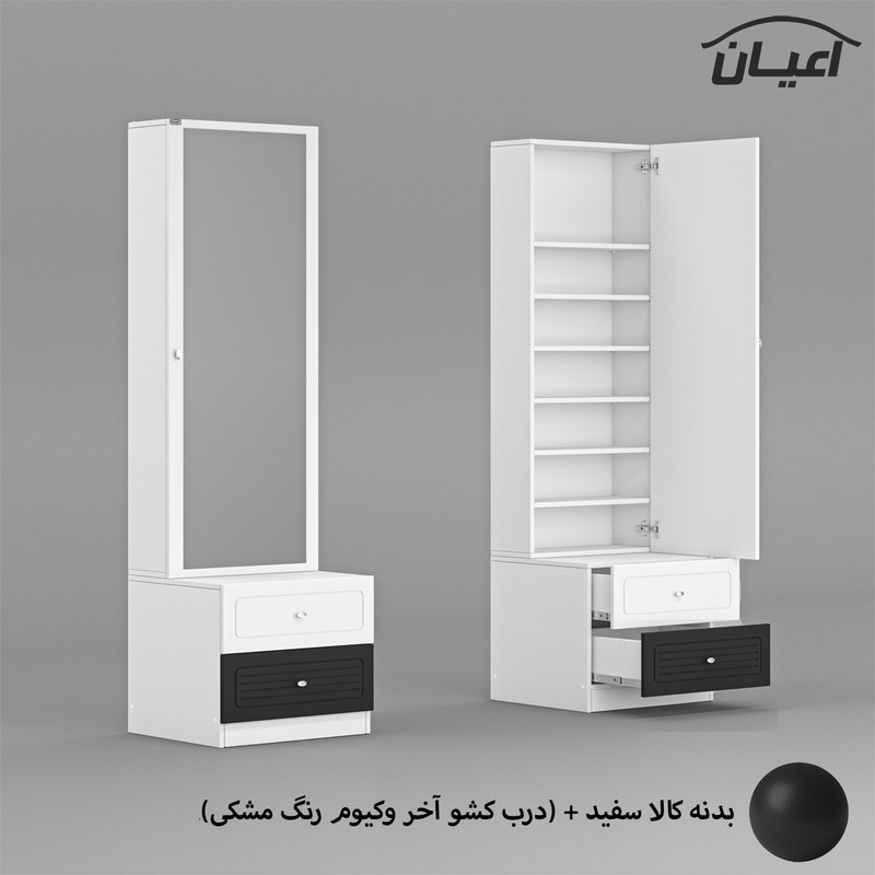 ست میز آرایش ، جنس بدنه : مغزی نئوپان با روکش ملامینه شرکتی ، کالا به صورت دوتکه می باشد :(که شامل یک میز با دو کشو ، کشوها دارای ریل سه تکه می باشد ، جنس درب کشوها : مغزی ام دی اف با روکش وکیوم می باشد و یک باکس (استند) کمدی دارای شش طبقه و هفت فضای مجزا برای قرار دادن لوازم آرایشی (مطابق تصاویر) ) این کالا در رنگ بندی : سفید ، طوسی ، مشکی ، قهوه ای روشن ، قهوه ای(گردویی) ، قهوه ای تیره(ونگه) ، سبز ، آبی و صورتی تولید و عرضه می گردد. در نظر داشته باشید که مطابق تصاویر محصول بدنه ی این کالا کاملا به رنگ سفید بوده و تنها رنگ کشوی آخر کالا دارای رنگ بندی متغیر می باشد. لطفا توجه داشته باشید که همواره چند درجه اختلاف رنگ بین تصاویر بارگذاری شده و کالای اصلی (ساخته شده) وجود دارد.