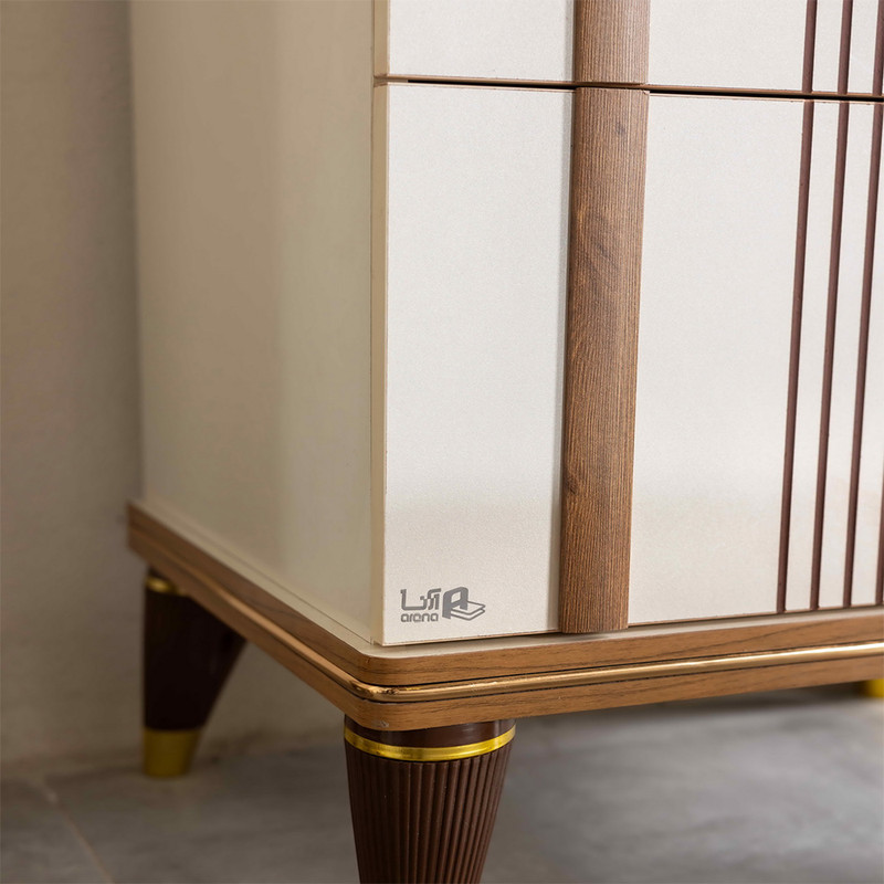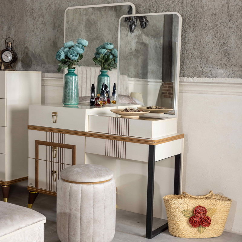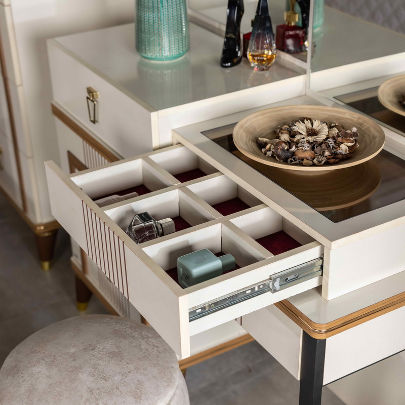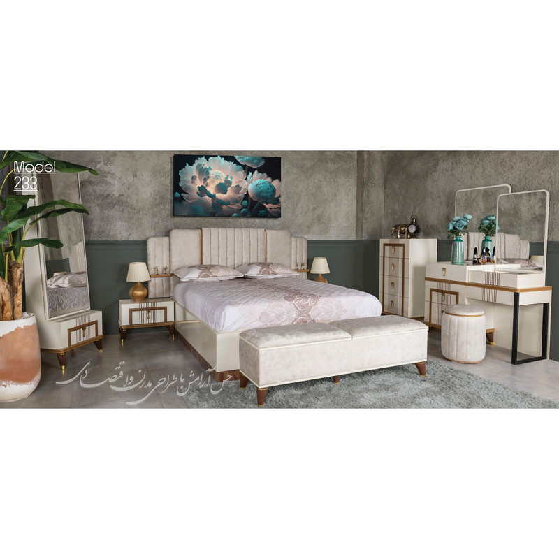 میز آرایش مدل 233 یک میز آرایش تمام ام دی اف است که دارای 3 کشوی بسیار بزرگ و جادار و 2 کشوی با کارایی خاص و زیبا می باشد.. کف کشو های ای میز آرایش از جنس ام دی اف 6 میلیمتری می باشد که توسط پیج داخل شیاری که در داخل دیواره ی کشو طراحی شده است بسیار مستحکم شده است و استقامت بالایی برای تحمل وزن اشیا دارند.. کف تمامی کشو ها به زیبایی مخمل کار شده است. میز آرایش مدل 233 دارای یک آینه 2 تکه بسیار خاص و جذاب است که از بهترین نوع کیفیت برخوردار است. متریال استفاده شده در این میز آرایش: ام دی اف وااناچای تایلند، ریل و یراق آلات وارداتی، اتصالات و ...