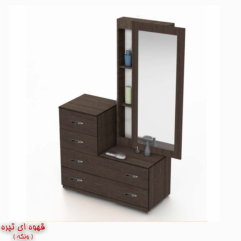 عرض میز آرایش ۹۰ سانتیمتر میباشد. عمق ۵۰ سانتیمتر میباشد. ارتفاع ۱۸۰ سانتیمتر میباشد. آینه بصورت شیب دار میباشد که زیبایی خاصی به دراور داده است. محصول فاقد عسلی (صندلی) میباشد. دستگیره های کشو فلزی استیل دو پیچ میباشد.