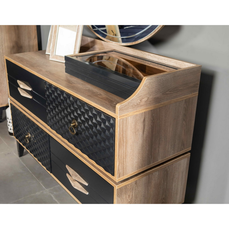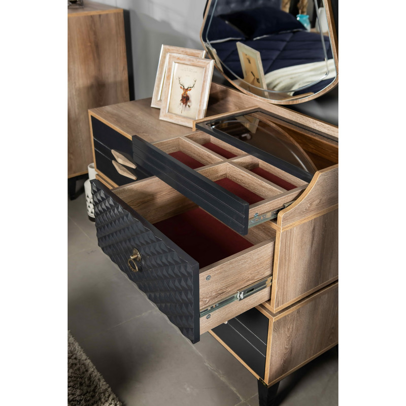 امروزه استفاده از میز آرایش در اتاق های خواب بسیار روال یافته ، اما با توجه به فضاهای کوچک اتاق خواب ها و یا کمد های دیواری، میز آرایش هم باید خصوصیات یک میز آرایشی را دارا باشد هم دارای فضای اختصاص یافته برای نگهدای و قرار دادن البسه و وسایل شخصی در کشوهای خود باشد. میز آرایش مدل 194 شرکت داری یک طراحی بسیار خاص و بی نظیر می باشد. 4 کشوی جادار مخصوص لباس و وسایل شخصی با درب کشو های رنگ شده با بهترین کیفیت رنگ پلی اورتان، و طرح مشبک درب کشو های این میز بر جذابیت آن اضافه کرده است. آینه مخروطی شکل و CNC شده ی میز آرایش مدل 194 در نوع خود بسیار خاص و زیبا طراحی شده است که جلوه ی زیبایی به اتاق خواب شما می بخشد. پایه ها و دستگیره های این میز آرایش از جنس چوب راش می باشد که حس اصالت و سادگی چوب را به دکوراسیون اتاق شما القا می کند. کف کشو ها در میز ها و دراور ها یکی از مهمترین قسمت های یک محصول است، چرا که اگر از ضخامت و استقامت خوبی برخوردار نباشند با گذاشتن وسایل سنگین در کشو، خیلی زود یب می بینند و از کشو جدا می شوند. جنس کف کشو های میز آرایش مدل 194 از ام دی اف 6 میل و مخمل کاری شده به زیباترین شکل ممکن می باشد میز آرایش مدل 194 تولید شده از بهترین ام دی اف های وارداتی و ریل و یراق آلات و اتصالات خارجی می باشد. اگر کیفیت محصول برای شما در اولویت می باشد و از افراد سخت پسند هستید با خیال راحت این میز آرایش را خریداری کرده و از کیفیت بالای این محصول لذت ببرید.