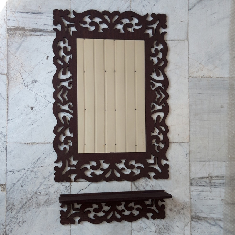 ست آینه و طاقچه پی وی سی خونه خاص که در تصویر مشاهده می کنید در مدل مستطیلی با مشبک های طرح بسیار زیبا تولید و به بازار عرضه گردیده است. بدنه ی PVC این آینه دکوری دارای خاصیت ضد آب و استحکام بسیار بالایی می باشد و از این رو شما میتوانید بدون نگرانی از کاهش کیفیت محصول از آن در محیط های مرطوب و آرایشگاه ها نیز استفاده نمائید. این ست متشکل از آینه مستطیلی و طاقچه کوچک دیواری است که با مشبک های بسیار زیبا با طرح تزئین گردیده است و به شما این امکان را میدهد تا بتوانید از آن علاوه بر کاربرد متداول در محیط های لوکس جهت تزئین دکوراسیون نیز استفاده نمائید. همچنین طاقچه دیواری همراه با آیینه به شما در نگهداری اع لوازم آرایشی، لوازم دکوری، لوازم شخصی بهداشتی و … کمک میکند. این آینه در رنگ های قهوه ای، نسکافه ای و طلایی هم تولید می شود که جنس آن mdf بوده، قابل شستشو نمی باشد ولی با توجه به رنگ دکور شما می تواند آینه ای زیبا و در خور توجه باشد. این محصول بصورت تک جعبه در کارتن خونه خاص تولید و ال می شود.