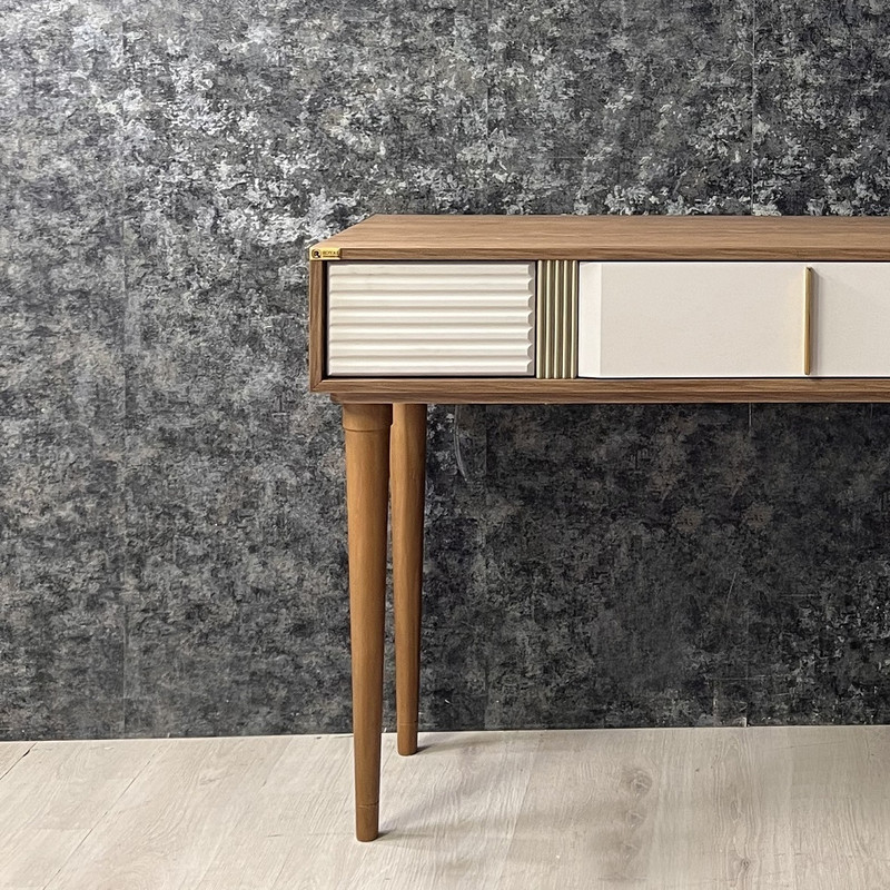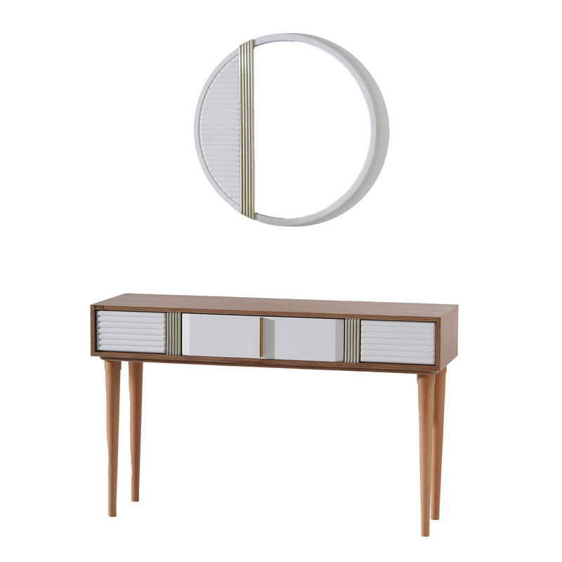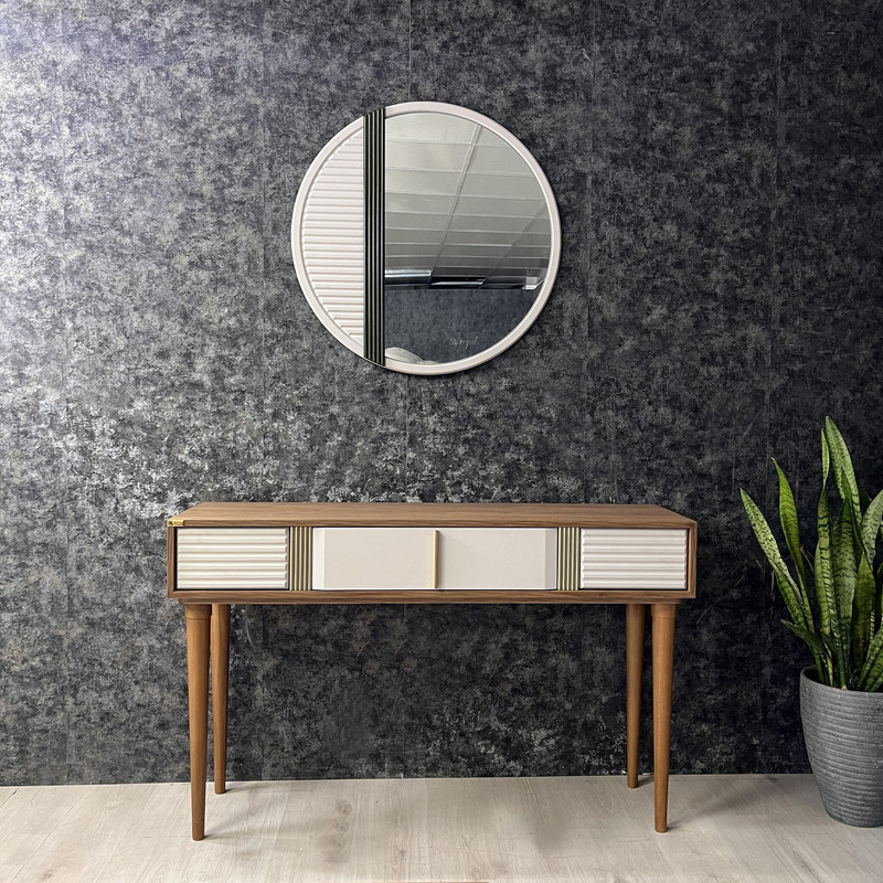 محصول فوق از جنس ام دی اف درجه یک و پایه ها به شکل مخروطی از جنس چوب راش گرجستان می باشد. محصول بصورت دو رنگ ترکیبی قهوه ای روشن و سفید تولید می گردد و دارای یک عدد کشو است. قطر آیینه 77 سانتیمتر و ارتفاع کنسول از کف 80 سانتیمتر می باشد