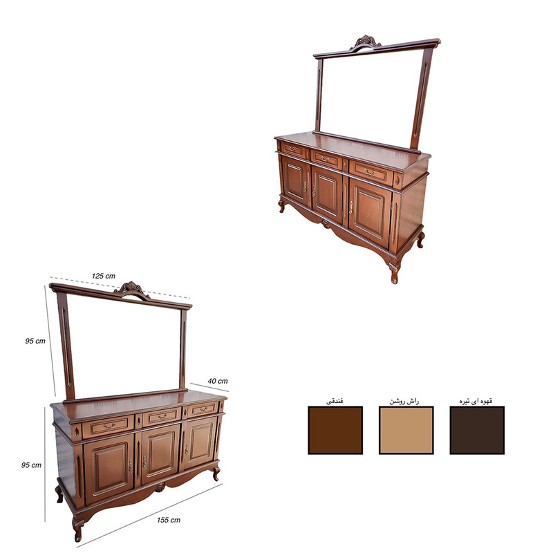 آیین و کنسول سه درب کلاسیک ترین مدل آیینه و کنسول های مجموعه می باشد که از لحاظ مواد اولیه و نوع چوب و رنگ با بقیه مدل های تفاوتی ندارد و تنها تفاوت آن از لحاظ طراحی می باشد ما از دل چوب طراحی کلاس جهانی را به شما عرضه می کنیم و می دانیم که این طراحی از جان دل آمده است که با وجود نوع طراحی تمام کلاسیک می باشد و سبک خاصی را به خانه شما می بخشد یکی از موارد خاص این مدل آیینه و کنسول قسمت های گل کاری آن می باشد که در عکسها موجود می باشد تمام قسمت های گل کاری آن چوب طبیعی راش می باشد و با تمام بازار که رزین و پلاستیک کار می کنند متفاوت چون تمام ظرافت های کار شده چوب طبیعی راش می باشد