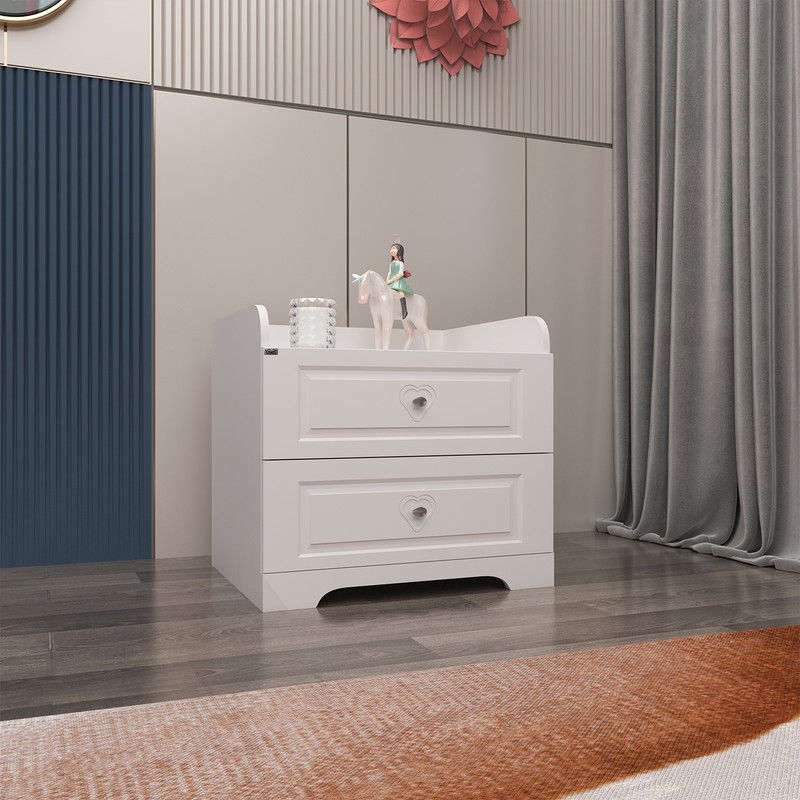 میز پاتختی طرح فانتزی-جنس بدنه نئوپان ملامینه شرکتی و درب ها ام دی اف با روکش PVC (وکیوم) است.دارای دو کشو با ریل ساچمه ای سه تکه - دستگیره تک پیچ استیل بوده و طرح قلب به صورت حکاکی بر روی درب کشوها وجود دارد - این کار به صورت مجموعه کامل در سرویس خواب مدل FH474 نیز در کنار تختخواب و کمد و دراور ست وجود دارد که میتواند برای نوجوان و بزرگسال به ویژه دختران انتخابی شیک و فانتزی باشد. xتنها در صورتی کالای انتخابی مطابق با تصاویر و مشخصات درج شده خواهد بود که هنگام انتخاب فروشنده، فروشنده ی رسمی برند که با تیک آبی مشخص شده است را انتخاب نمایید. این کالا توسط برند در رنگ های سفید/مشکی/قهوه ای/قهوه ای روشن/قهوه ای تیره(ونگه) و چندرنگ تولید می شود رنگ بندی کالا در آلبوم قابل مشاهده است.