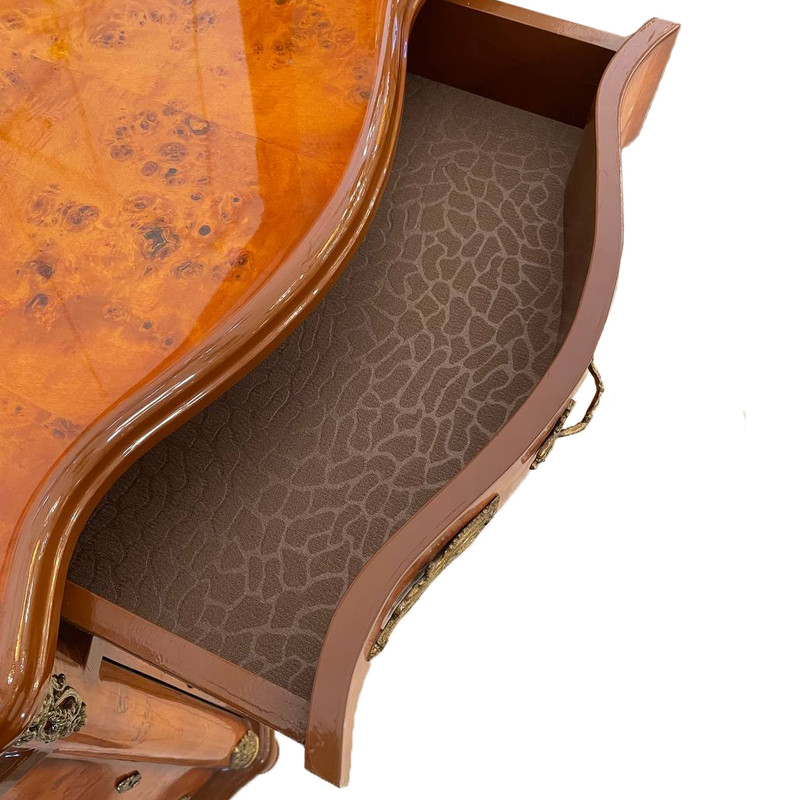 آینه کنسول مدل درباری، با طراحی فاخر و جزئیات بینظیر، جلوهای اشرافی به فضای داخلی خانه شما میبخشد. این مدل با بهرهگیری از روکش معرق و تزیینات برنزکوب بر روی آینه و بدنه کنسول، شکوه و ظرافتی کمنظیر را به نمایش میگذارد. کنسول درباری با طول ۱۴۰ سانتیمتر، عرض ۵۰ سانتیمتر و ارتفاع ۹۴ سانتیمتر طراحی شده و فضای مناسبی برای چیدمان در پذیراییها یا سالنهای مجلل فراهم میکند. بخش پایینی کنسول شامل یک کشو مرکزی و سه درب در اطراف آن است که علاوه بر حفظ نظم، جلوهای منسجم و زیبا به محصول میدهد. آینه بزرگ این مدل با ابعاد ۱۱۷ در ۸۵ سانتیمتر، با همان ظرافت معرق و برنزکوب تزیین شده و هماهنگی کامل با بدنه کنسول دارد. انعکاس نور در این آینه و جزئیات هنرمندانهاش، حس وسعت و شکوه را در فضا چند برابر میکند. آینه کنسول درباری، انتخابی فوقالعاده برای کسانی است که به دنبال ترکیبی از زیبایی سلطنتی، کیفیت بالا و هنر اصیل هستند.