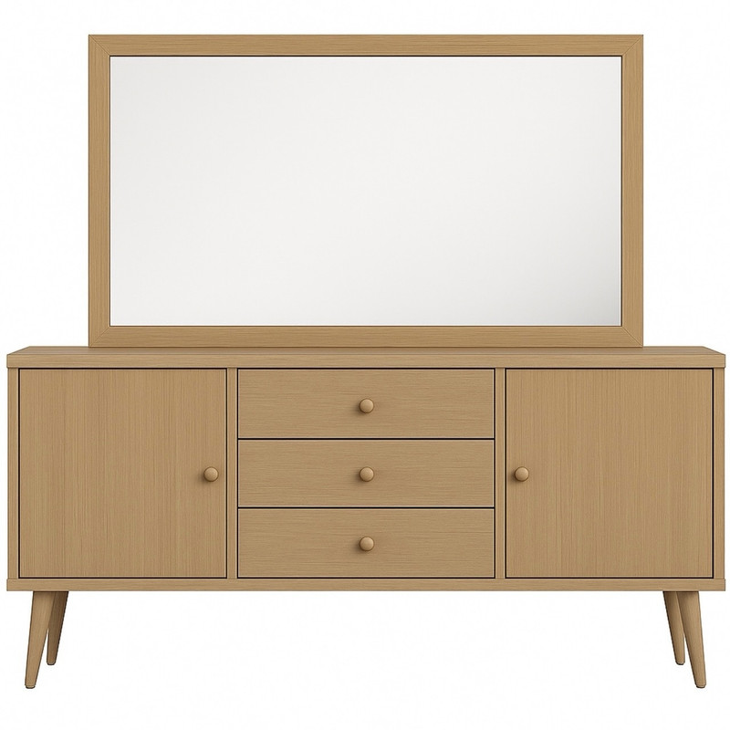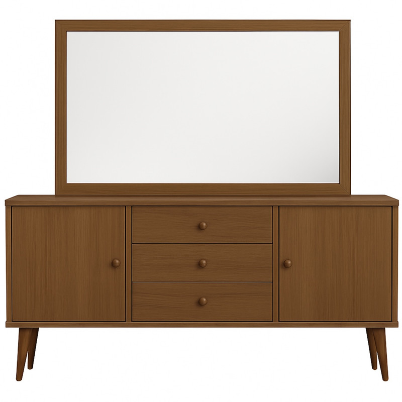 این آیینه کنسول با طراحی مدرن گزینهای ایدهآل برای اتاقخواب یا فضای ورودی منزل است. بدنه تمام لترون با روکش ملامینه مقاوم در برابر خط و خش ساخته شده و سه کشو با عمق مناسب و دو کمد در طرفین فضای کافی برای نگهداری وسایل آرایشی، لوازم شخصی فراهم میکند. آیینه بزرگ با قاب همرنگ، جلوهای زیبا و کاربردی به محصول بخشیده است. پایههای مخروطی چوبی نیز علاوه بر استحکام، زیبایی خاصی به طراحی آن داده است