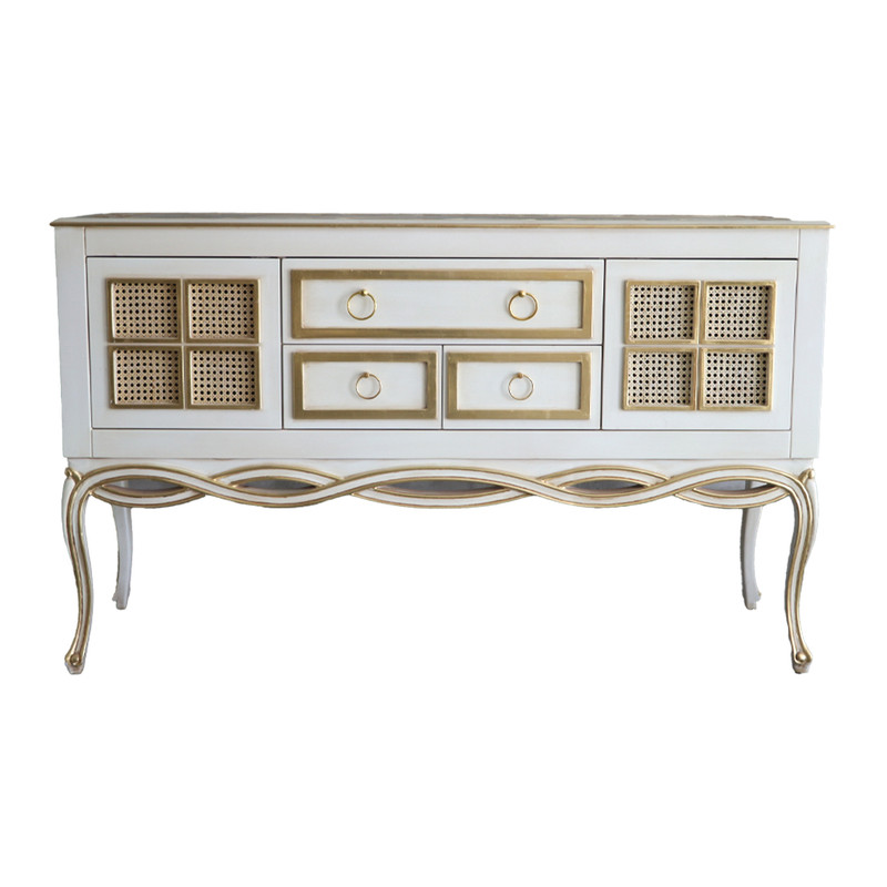 میز کنسول چوبی ایتالیایی ابزاری همان طور که مشاهده میکنید، از رنگ و طرح جذابی استفاده کرده است، یکی از نکتههای قوت در میز کنسول چوبی ایتالیایی ابزاری بهره گیری از رنگ طلایی در میز کنسول میباشد که چشم زی بالایی به کار بخشیده است و میتواند پیشنهاد خوبی برای دکوراسیون منزل شما باشد، در ادامه توضیحات بیشتری درباره این میز کنسول به شما خواهیم داد. یکی از فواید و کارایی میز کنسول در دکوراسیون منازل، امکان دسترسی بهتر وسایل پذیرایی در منزل میباشد شما میتوانید هر نوع وسیله ای تزئینی و یا وسایل پذیرایی را در میز کنسول خود جای بدهید، اما اگر توجه نمایید علاوه بر اینکه فضای دسترسی خوبی دارد، ظاهر با شکوه و جذابی هم دارد که زیبایی کار را چندین برابر کرده است. از متریالی که در میز کنسول چوبی ایتالیایی به کار رفته است میتوان به استفاده از چوب راش گرجستان در قسمت پایه و همچنین بهره گیری از ام دی اف واناچای تایلند در قسمت رویه میز آن اشاره داشته باشیم، همچنین اینکه طرح حصیری و پنجرهای که در میز کنسول به کار رفته است. از ویژگیهای مهم در میز کنسول چوبی میتوان به پایههای بلند و همچنین نوع رنگ پردازی زیبای میز کنسول آن بپردازیم توجه فرمایید که رنگ تنوع به کار برده شده برای رنگ منبت، حصیر، حاشیه دور کشو، طرح رنگی روی میز، هلال قسمت پایه میز، رنگ دستگیره ها میباشد. رنگ پایه میز کنسول ایتالیایی ابزاری رنگ سفید می باشد که در تنوع شما با انتخاب رنگ های مثلا طلایی، آبی، قرمز، و هر رنگ دیگری، رنگ حاشیه این میز کنسول را انتخاب میکنید.
