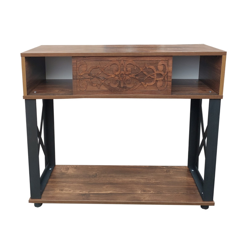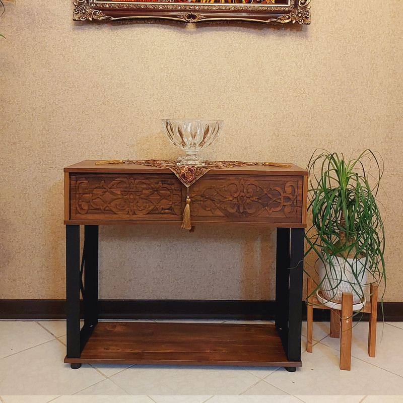 طراحی زیبا و سادگی از ویژگی های این کنسول است. این کنسول دارای دو کشو می باشد. درب های این کشو با طرح اسلیمی برش خورده و جنس آن ام دی اف شش میلیمتری است که به صورت ریلی باز می شود. این میز از جنس ملامینه است که لبه های آن پی وی سی شده است. پایه های این کنسول از ام دی اف خام هشت میلیمتری ساخته شده است که با رنگ اکریلیک مشکی رنگ آمیزی شده است. پایه های پلاستیکی کف آن قابلیت تراز کردن میز را می دهد. این میز با هشت پیچ به راحتی مونتاژ می شود. لینک فیلم آموزش مونتاژ در بسته بندی قرار دارد.