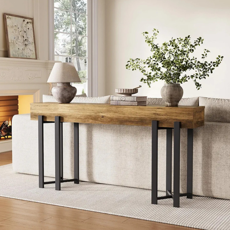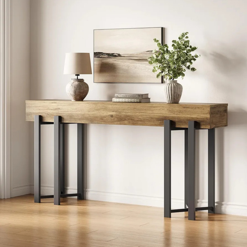این میز کنسول با ترکیب چشمز چوب طبیعی و پایههای فلزی مشکی، نمونهای زیبا از تلاقی طراحی مدرن و حس گرمای طبیعت است. سطح چوبی با بافت واقعی و ضخامت متعادل خود، جلوهای از اصالت و استحکام را به نمایش میگذارد، در حالی که پایههای فلزی با فرم هندسی ساده، ساختاری پایدار و مینیمال را فراهم میکنند. این میز برای استفاده در ورودی خانه، پشت مبل یا فضای نشیمن طراحی شده و بهخوبی میتواند بستری برای چیدمان گلدان، آینه، قاب عکس یا وسایل تزئینی باشد. تناسب ابعاد و سادگی خطوط باعث میشود با هر نوع دکوراسیون — از مدرن گرفته تا — هماهنگ شود. ساختار محکم، پوشش مقاوم در برابر خط و خش و جزئیات دقیق در اتصالات، از این میز قطعهای و کارآمد میسازد.