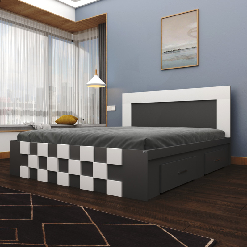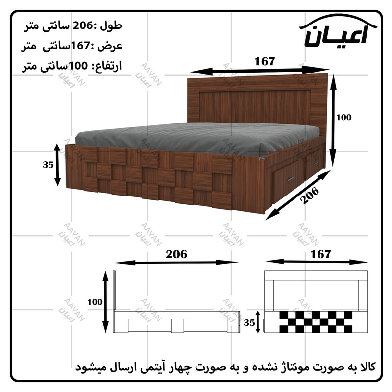 تخت خواب دو نفره .جنس نئوپان ملامینه شرکتی. کلگی دارای طراحی مدرن که به صورت قید دوبل می باشد. کالا فاقد تشک می باشد. سایز تشک مناسب 160x200سانت است کالا به صورت مونتاژ نشده (جدا از هم) ال می شود - دارای دو عدد کشوی چرخدار که قابل جابجایی است- بسته بندی کالا به صورت چهار آیتمی است - جنس کفی تخت نئوپان به صورت سه تکه است - رنگ بندی کالا در آلبوم قابل مشاهده است(در رنگ های سفید/مشکی/قهوه ای/قهوه ای روشن/قهوه ای تیره (ونگه)/گردویی/طوسی و چند رنگ(سفید و طوسی) تولید می شود)-تنها در صورتی کالای انتخابی مطابق با تصاویر و مشخصات درج شده خواهد بود که هنگام انتخاب، فروشنده رسمی برند که با تیک آبی مشخص شده است را انتخاب نمایید. هنگام خرید و دریافت کالا به بسته بندی و لوگوی برند دقت فرمایید.