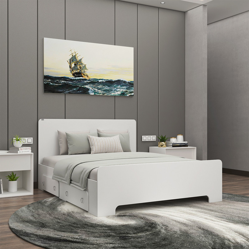 تخت خواب دو نفره ، جنس نئوپان با روکش ملامینه، طراحی ساده، شیک و کلگی و بخش های مختلف دارای طراحی CNC منحنی ، دارای دو کشو با چرخ چمدانی (ساکی) ، کالا فاقد تشک می باشد، کفی به صورت سه تکه به همراه چند جفت پایه متحرک است، سایز تشک مناسب برای تخت خواب(200×160 سانتی متر) می باشد ، این کالا با رنگ بندی (سفید ، طوسی ، مشکی ، قهوه ای روشن ، قهوه ای (گردویی) ، قهوه ای تیره (ونگه) و حالت چند رنگ (سفید ، قهوه ای) تولید و عرضه می شود ، این کالا را فقط با لوگو و برند تهیه کنید، لطفا توجه داشته باشید که همواره چند درجه اختلاف رنگ بین تصاویر بارگذاری شده و کالای ساخته شده وجود دارد.