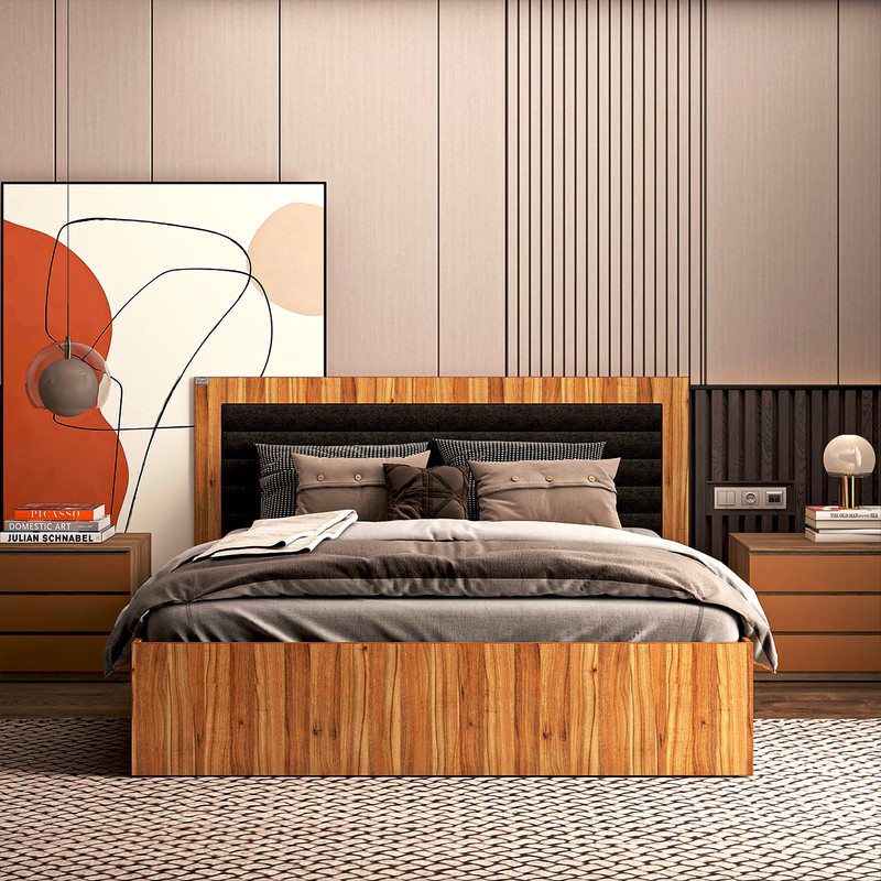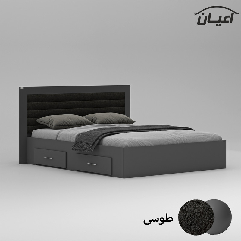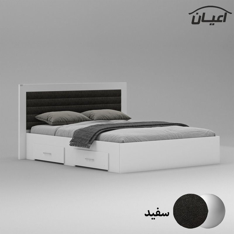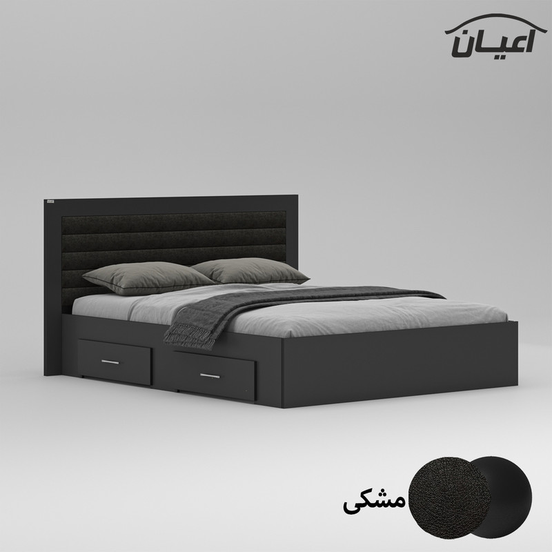 تخت خواب دو نفره ، جنس نئوپان با روکش ملامینه، طراحی ساده، شیک و ترکیب با لمسه چرم مصنوعی مشکی، دارای دو کشو با چرخ چمدانی (ساکی) ، کالا فاقد تشک می باشد، کفی به صورت سه تکه به همراه چند جفت پایه متحرک است، سایز تشک مناسب برای تخت خواب(200×160 سانتی متر) می باشد ، این کالا با رنگ بندی (سفید ، طوسی ، مشکی ، قهوه ای روشن ، قهوه ای (گردویی) ، قهوه ای تیره (ونگه) ) تولید و عرضه می شود ، این کالا را فقط با لوگو و برند تهیه کنید، لطفا توجه داشته باشید که همواره چند درجه اختلاف رنگ بین تصاویر بارگذاری شده و کالای ساخته شده وجود دارد.