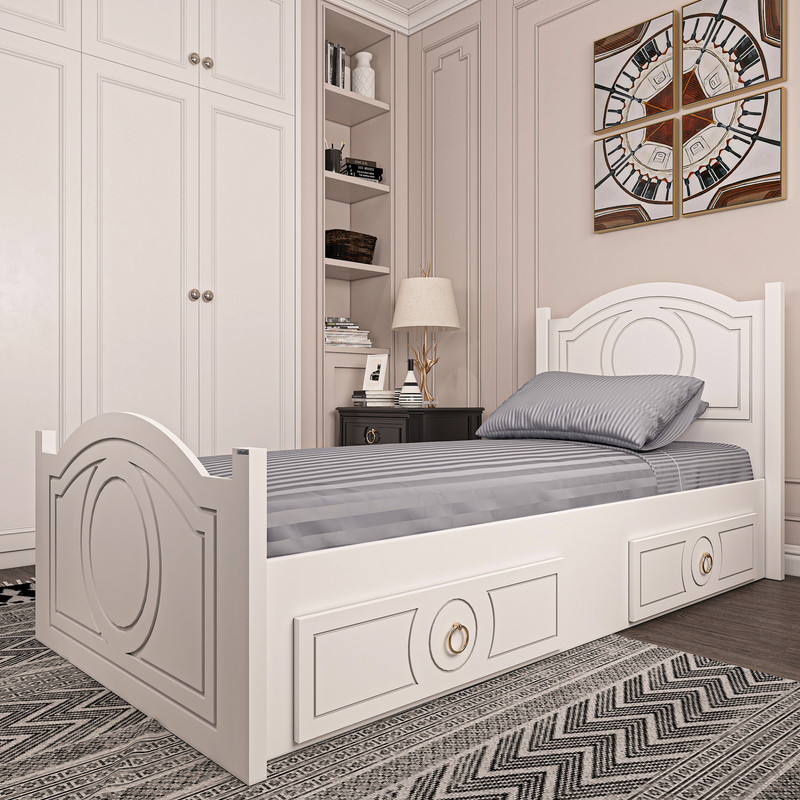 تخت خواب یکنفره -جنس مغزی ام دی اف با روکش وکیوم-کلگی هاو کشو ها به صورت سی ان سی حک شده است-دارای دو کشو چرخدار میباشد (کشو ها قابل جابجایی میباشند) - ابعاد استاندارد تشک 90x200 سانتی متر- کالا فاقد تشک میباشد - جنس کفی نئوپان خام و به صورت دو تکه میباشد-کالا به صورت مونتاژ نشده و بسته بندی به صورت چهار آیتمی میباشد.
