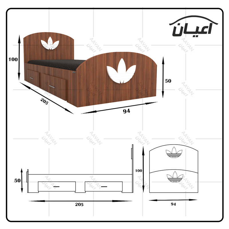 تخت خواب یک نفره طرح اسپرت.جنس ملامینه شرکتی.جنس لوگو روی تخت وکیوم می باشد در رنگبندی متنوع و در ابعاد استاندارد.کالا فاقد تشک می باشد جهت تهیه تشک،سایز استاندارد 200×90 سانت مناسب است.جنس کفی تخت نئوپان خام و به صورت دوتکه بوده که همراه با چند جفت فاق و زبانه به عنوان پایه در بسته بندی جداگانه ال می شود.تخت دارای دو کشو به صورت چرخدار است.کشوهای تختخواب امکان قرارگیری در سمت چپ یا راست را دارند. این محصول به صورت مونتاژ نشده در چهار بسته بندی همراه با بروشور راهنمای نصب با لوگو و برند ال می شود. این کالا توسط برند در رنگ های سفید/مشکی/قهوه ای/قهوه ای روشن/قهوه ای تیره(ونگه) و حالت چند رنگ که مشابه تصاویر آلبوم محصول تولید می شود .