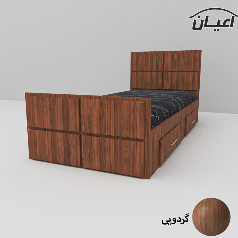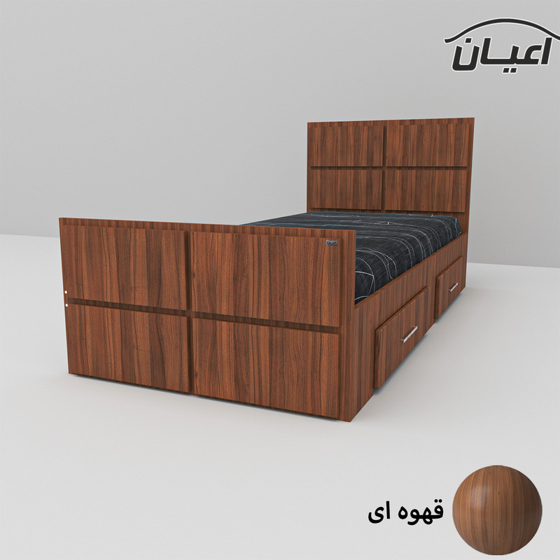 تخت خواب یک نفره .جنس نئوپان ملامینه شرکتی.کلگی ها به صورت مربعی دوبل می باشد.در رنگبندی متنوع و در ابعاد استاندارد.کالا فاقد تشک می باشد جهت تهیه تشک،سایز استاندارد 200×120 سانت مناسب است.جنس کفی تخت نئوپان خام و به صورت دوتکه بوده که همراه با چند جفت فاق و زبانه به عنوان پایه در بسته بندی جداگانه ال می شود.تخت دارای دو کشو به صورت چرخدار است.کشوهای تختخواب امکان قرارگیری در سمت چپ یا راست را دارند. این محصول به صورت مونتاژ نشده در چهار بسته بندی همراه با بروشور راهنمای نصب با لوگو و برند ال می شود. این کالا توسط برند در رنگ های سفید/مشکی/قهوه ای/گردویی/قهوه ای روشن/قهوه ای تیره(ونگه) /طوسی و حالت چند رنگ که مشابه تصاویر آلبوم محصول تولید می شود .