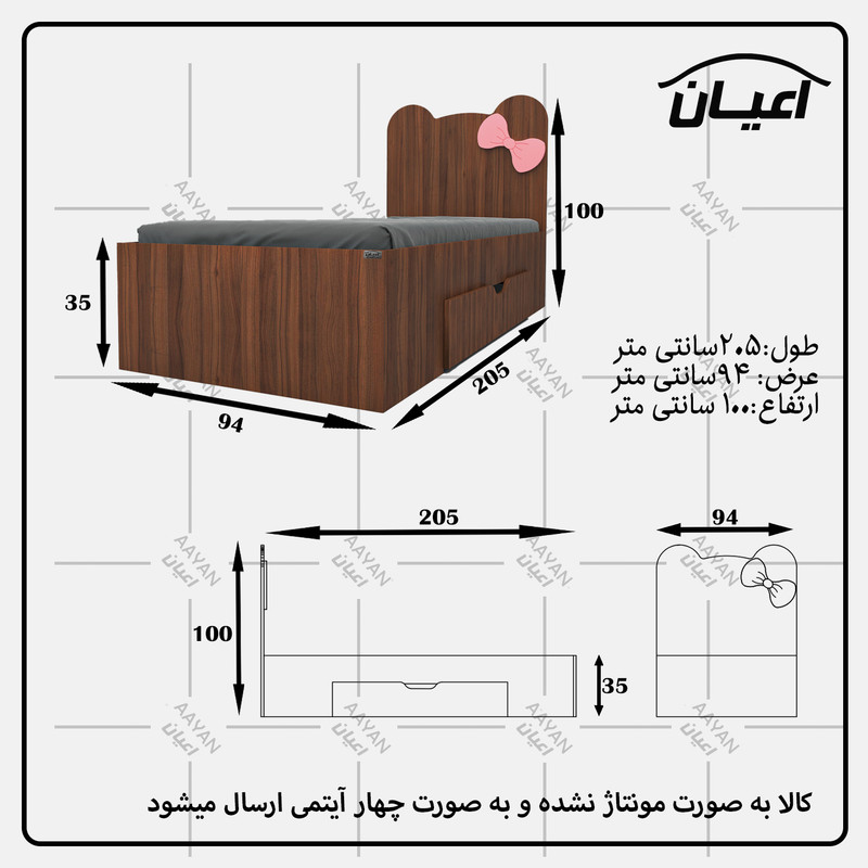 تخت خواب یکنفره طرح پاپیون -جنس مغزی نئوپان با روکش ملامینه شرکتی-پاپیون وکیوم - کالا فاقد تشک می باشد - سایز تشک مناسب 90x200سانت است - کالا به صورت مونتاژ نشده(جدا از هم) ال می شود - دارای یک عدد کشوی چرخدار که قابل جابجایی است- بسته بندی کالا به صورت چهار آیتمی است - جنس کفی تخت نئوپان به صورت دو تکه است - رنگ بندی کالا در آلبوم قابل مشاهده است(در رنگ های سفید/مشکی/قهوه ای/قهوه ای روشن/قهوه ای تیره (ونگه)/گردویی/طوسی و چند رنگ(سفید و طوسی) تولید می شود)-تنها در صورتی کالای انتخابی مطابق با تصاویر و مشخصات درج شده خواهد بود که هنگام انتخاب، فروشنده رسمی برند که با تیک آبی مشخص شده است را انتخاب نمایید. هنگام خرید و دریافت کالا به بسته بندی و لوگوی برند دقت فرمایید.